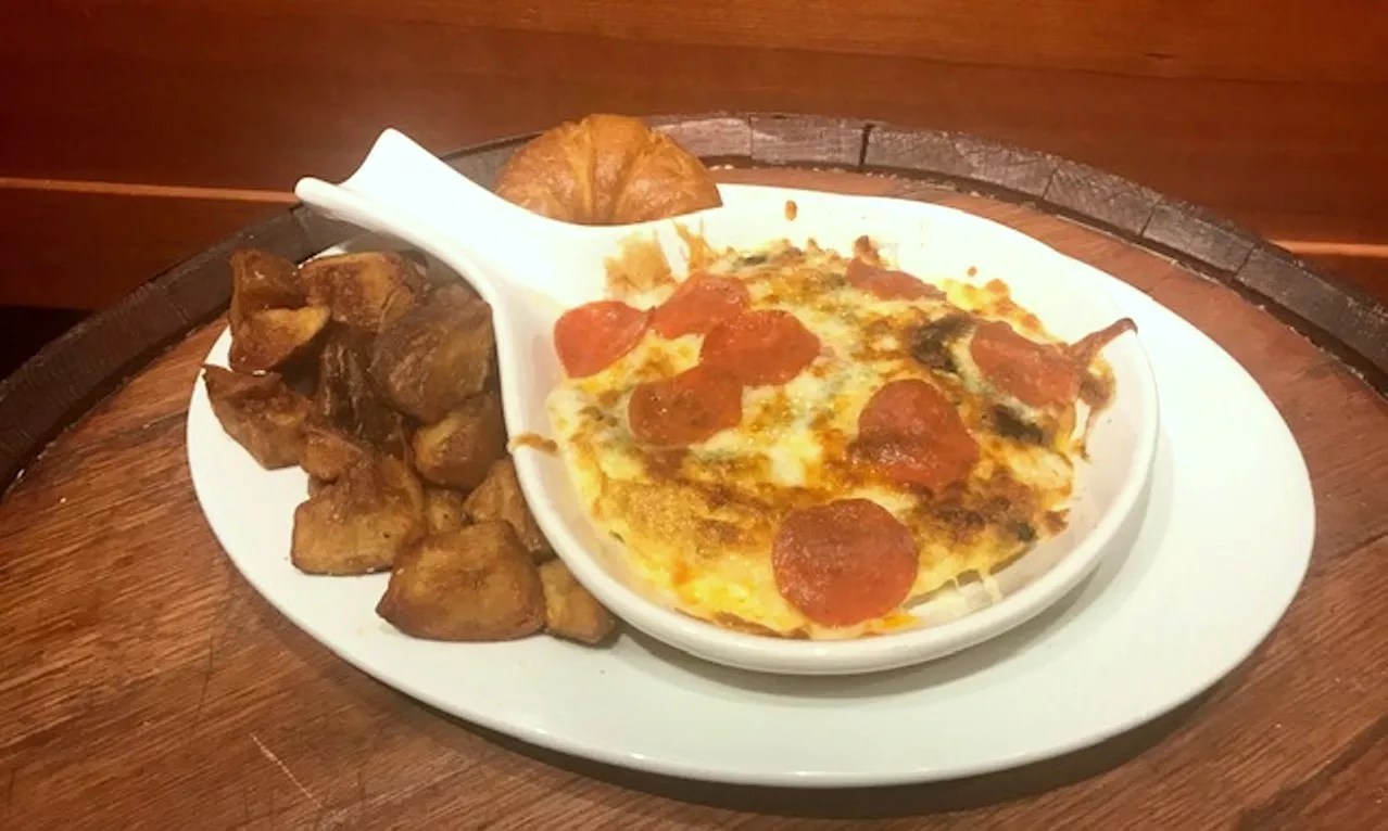 Next up is the egg-white pizza, which is basically a frittata’s sexier cousin. A fluffy egg-white base snuggled into a cute ceramic skillet comes topped with bubbly mozzarella cheese, pepperoni, chicken and spinach. It’s heartier than it sounds and comes with home fries and a croissant.