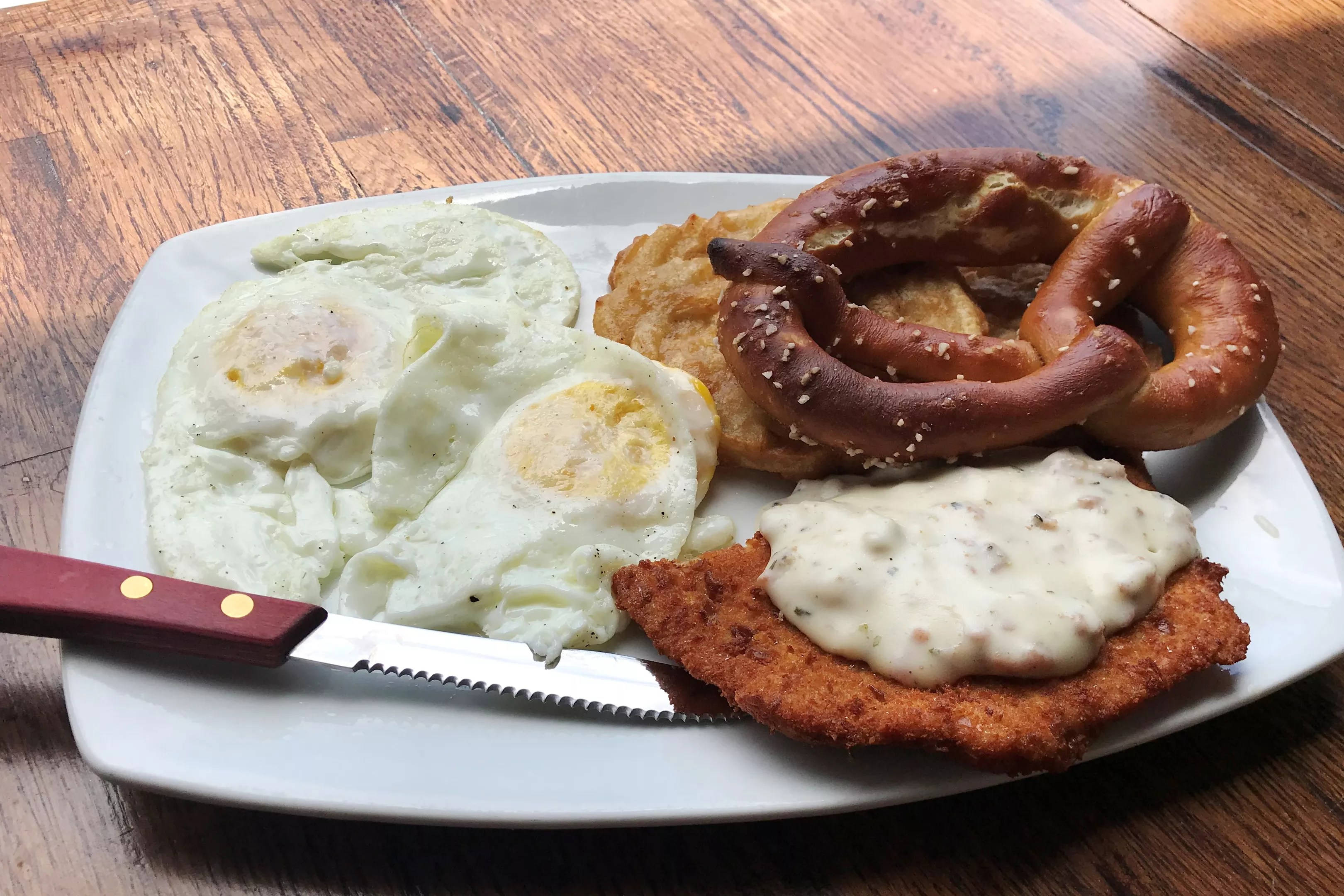 Lager lovers, unite! – at Rhein Haus, which boasts more than twenty beers on tap, many of them German imports and pilsners. But I’m on a brunch mission at this LoDo beer hall, and I get that not everybody wants a stein of suds with their morning meal.