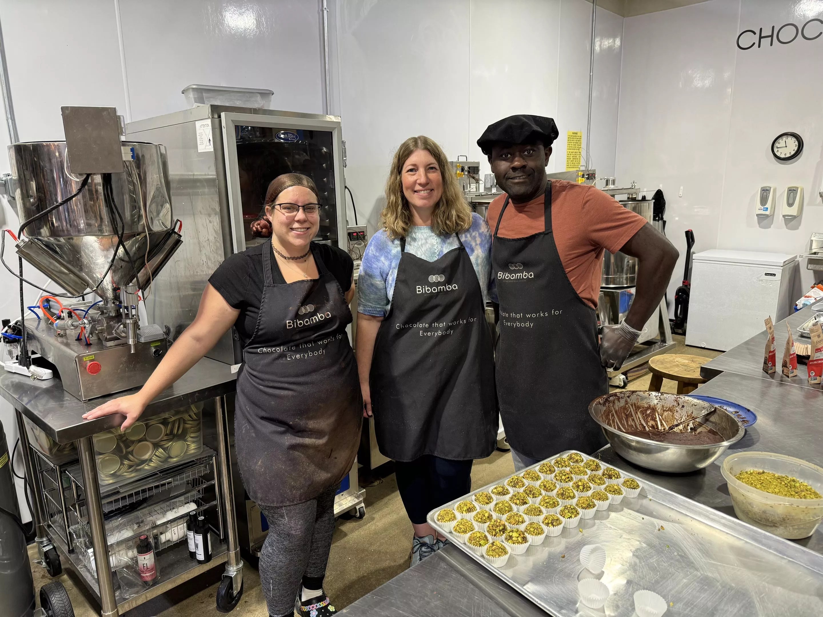 From left to right: Mahaila Deshotel (employee) with Mara and Patrick Tcheunou in their Edgewater Market retail/factory space.