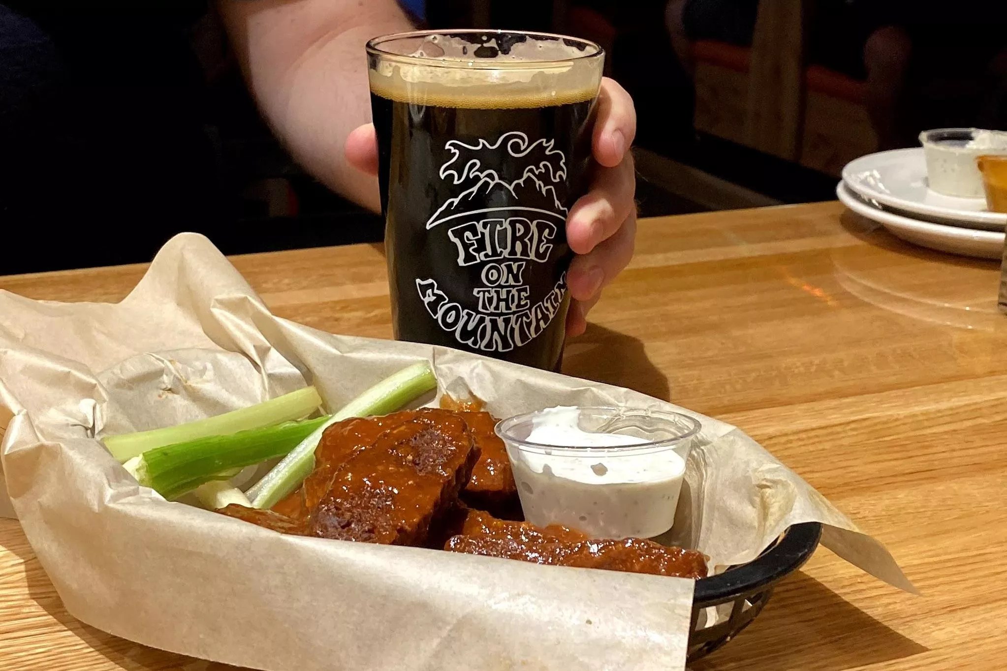 I’ll come right out and say that I’m not a tater tot enthusiast, but the group demanded we indulge. I’m still not a convert, but I can verify that Fire on the Mountain knows how to a fry a mean tot. It’s like this crunchy potato matrix that stands up to a slather of sauce yet gives way to pillowy spud interiors. Needless to say, we demolished them before the wings arrived. On the chicken wing side, we tried lime-cilantro, Jamaican jerk, spicy peanut, hot Buffalo, and the month’s special, garlic parm. The Buffalo sauce rose to the occasion where others so often fail: not too acidic and with a lingering spice that wasn’t prohibitive, but did invite a cooling beer back. Likewise, the Jamaican jerk, though not complex like some jerk rubs, allowed for my friend to maintain her “proper jerk levels” and was surprisingly tasty paired with blue cheese. The bright and citric lime-cilantro sauce is a tried-and-true, while I can take or leave the spicy peanut, mostly because that’s not what I’m going for at a place like Fire on the Mountain. The garlic parm, though, tasted odd on chicken wings – but that didn’t keep me from wanting to smother all manner of other edibles, especially the more carb-heavy apps, with the sauce. Also, what’s with the anemic celery sticks in restaurants; is there a celery shortage somewhere that I don’t know about?