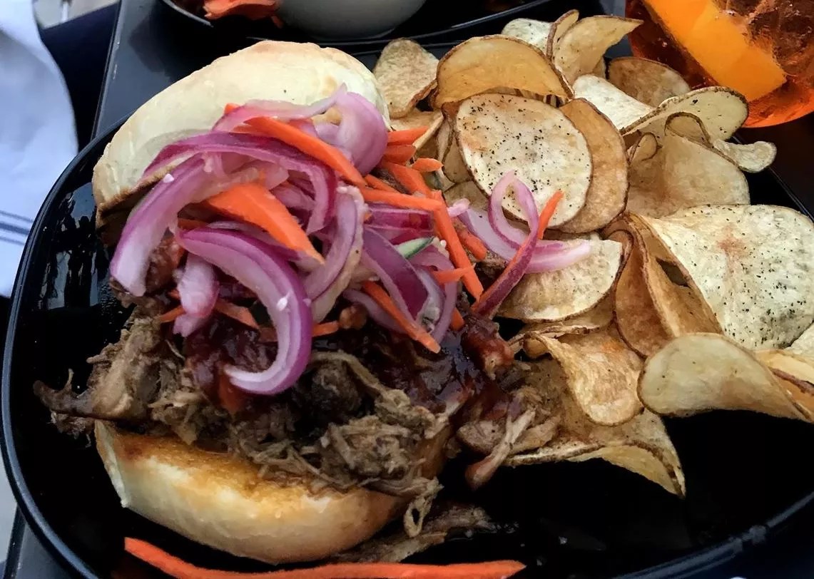 Finally, though tempted by the wagyu burger, which I intend to go back for, we ended up doubling down on pork with a pulled-pork sandwich. All the bread products appear to be made in-house, their intoxicating aroma wafting by each time we passed the counter. Though a bit dense, the bun is perfectly toasted and buttered (perhaps aiolied), making for a solid pork vessel. Whoever Irv is, his BBQ sauce is not as prominent as one might hope, though the tender pork really didn’t need it. Finally, housemade chips alternated between crunchy and stale, making it into a sort of chip roulette. But at that point, we were so well fed, the mercurial potatoes were hardly appealing.