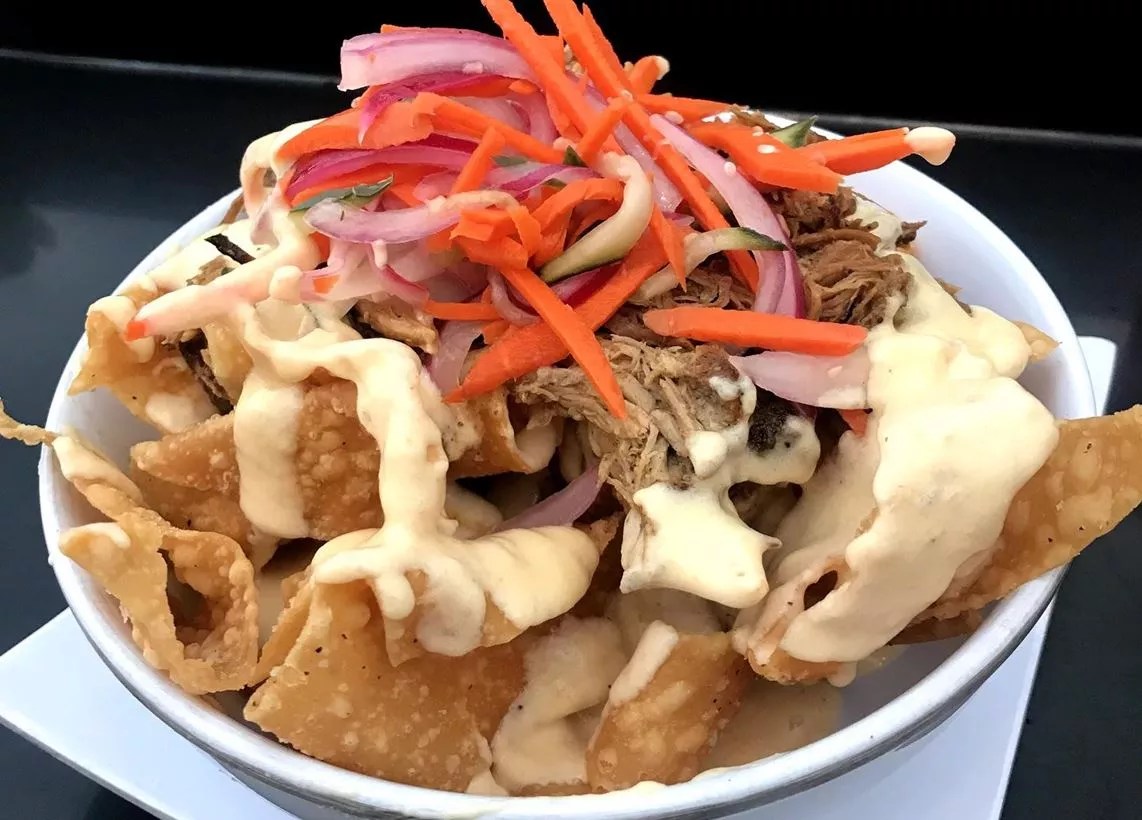 Next, the braised-pork nachos, with smoky, porky goodness creatively piled atop bubbly fried wonton chips and coated with “Welsh cheddar bechamel,” are a little weird, but also delicious. Eat fast, however; the fact that they’re served in a bowl rather than on a plate (as, one might argue, nachos should be) means the bottom wonton chips soggify if they bathe in the liquid cheese sauce for too long. Had we not gotten that, I would have sprung for the indulgent-looking Cheee-zey Fries, which swap out one pork product for another (bacon).