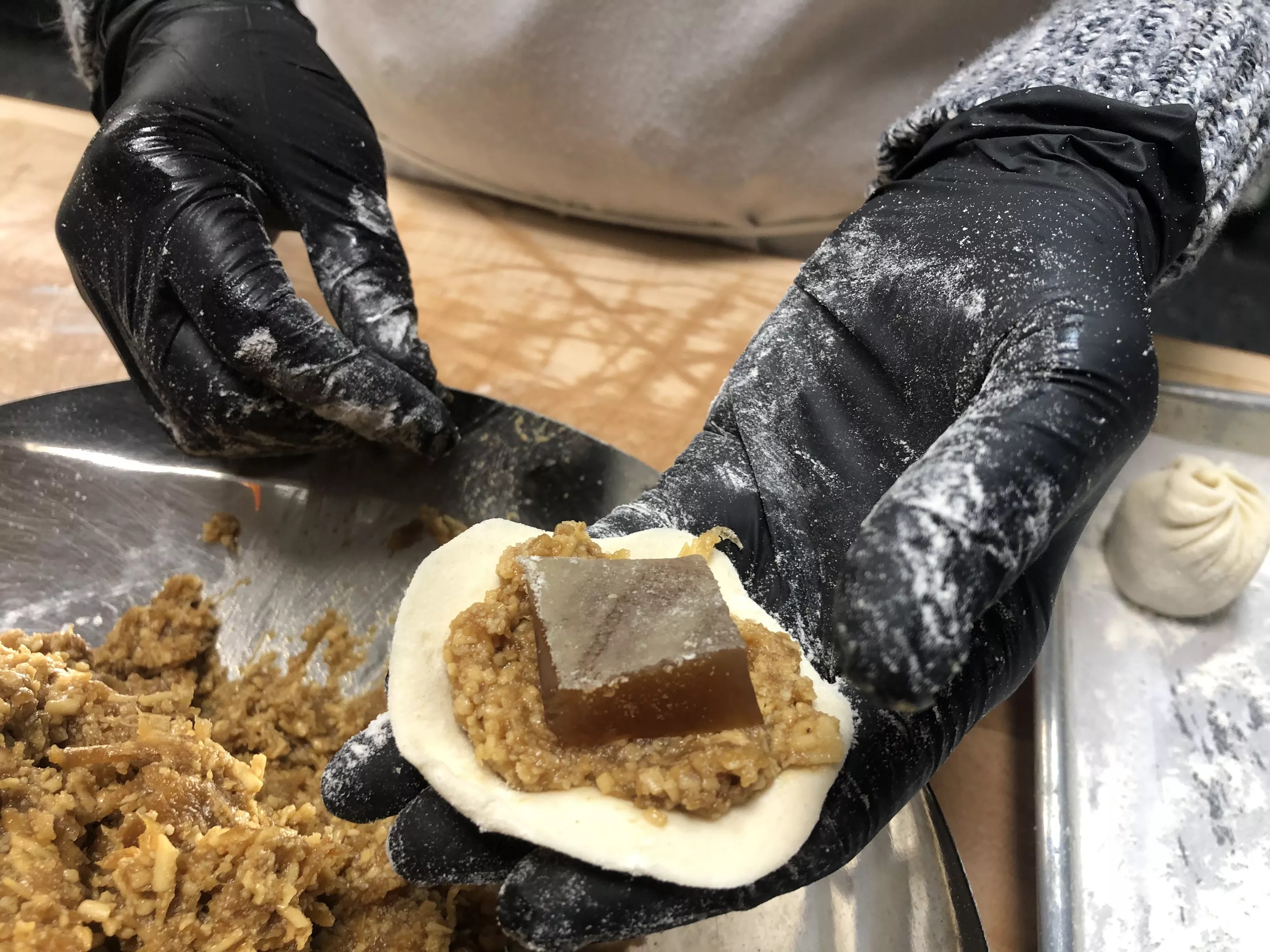 The secret to getting soup in a dumpling is to chill the stock into a gelatin cube.