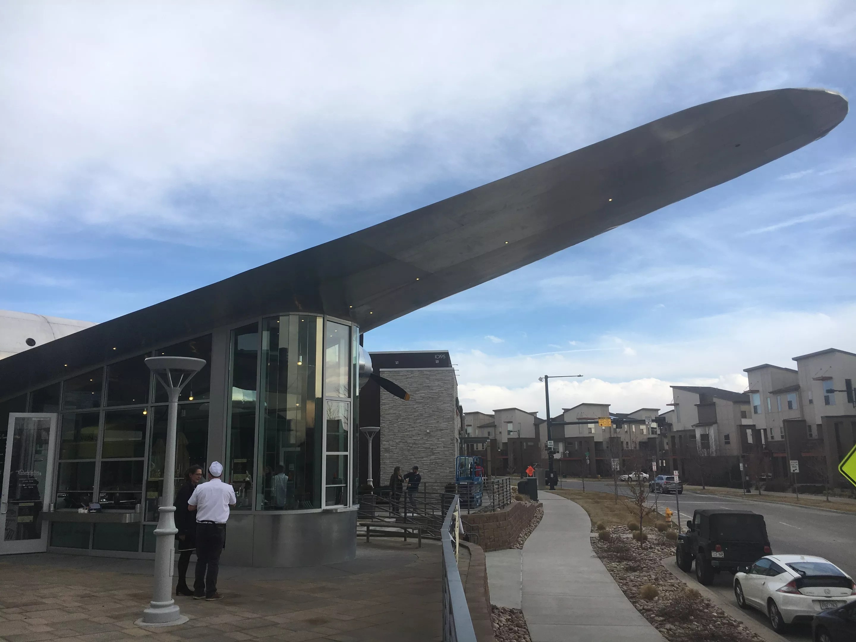 The wing of the Constellation extends over the sidewalk on East 29th Drive in Stapleton.