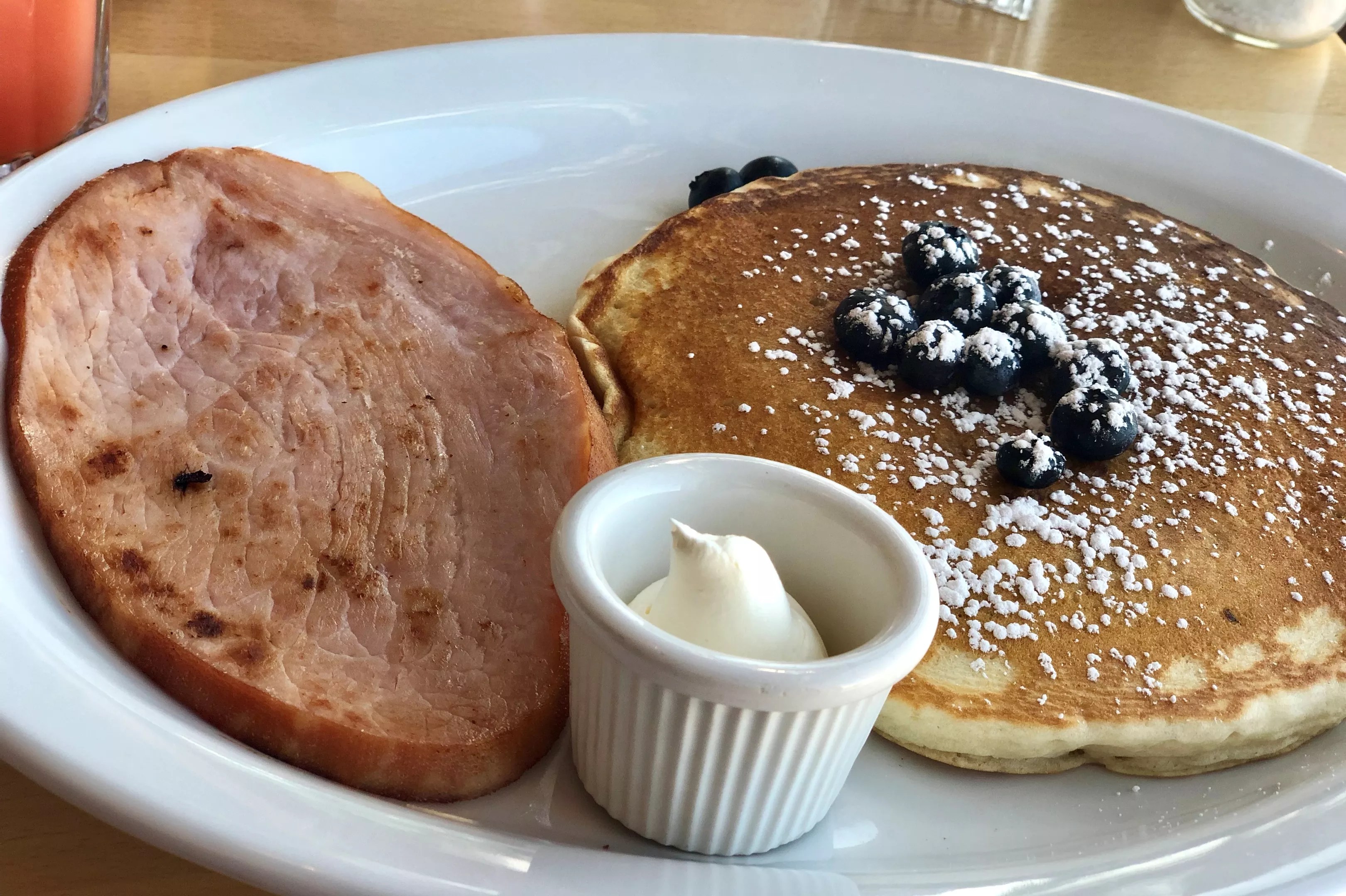 If you do bring the little ones, you can still order them a kid-friendly breakfast even if there’s not a printed kids’ menu. One plain or blueberry pancake with a choice of meat is a good portion size, and the pancakes aren’t too sweet (even if ours were a little chewy). And the fresh blueberries gave the fruit-filled hotcake a lovely tart flavor that complemented airy whipped butter that you’ll surely want to anoint your warm cakes with immediately.