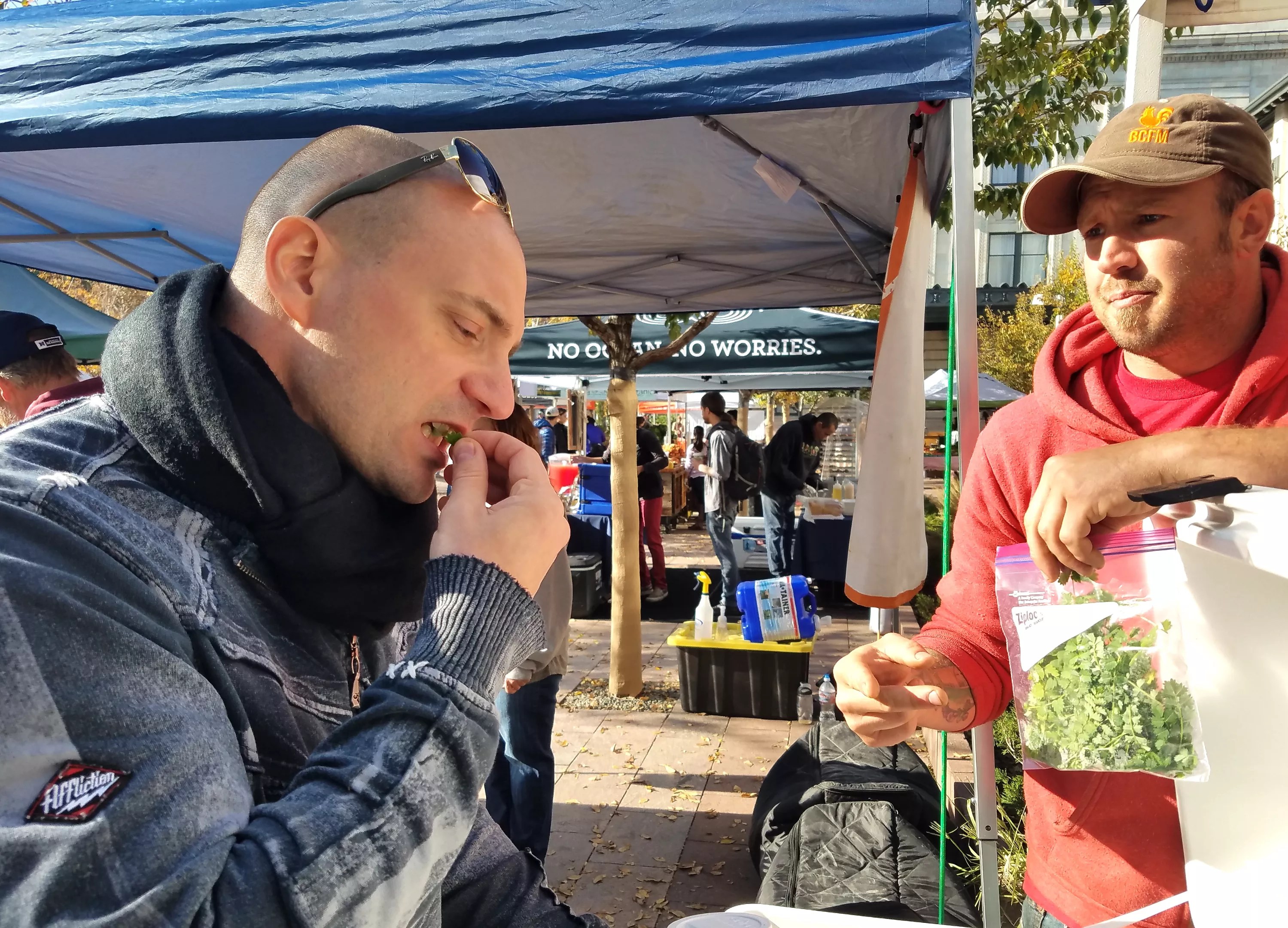 Josh Olsen gives Lebas a taste of salad burnet, an herb that has a bitter cucumber and mint essence.