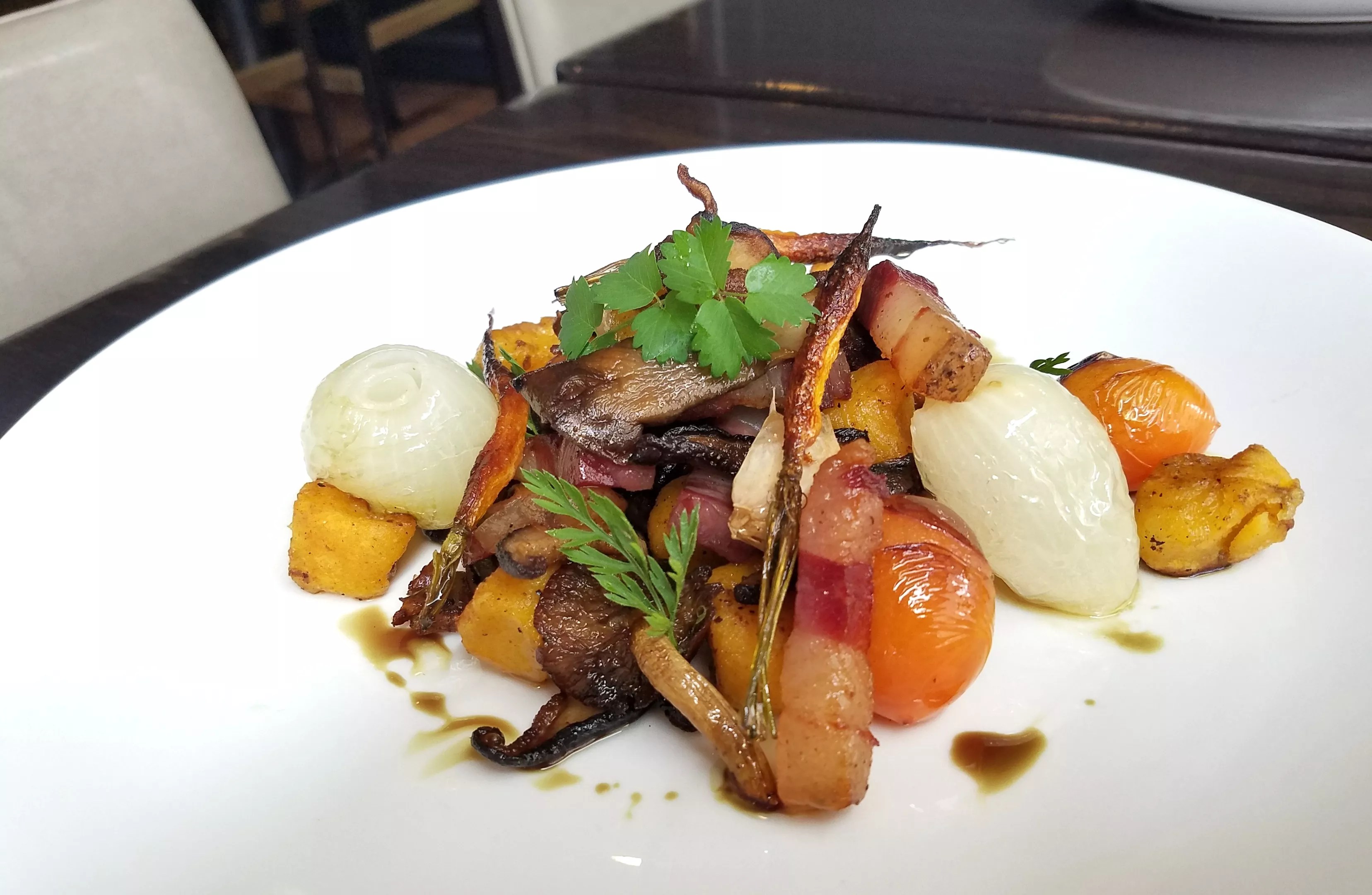 Georgia Candy Roaster gnocchi with crispy pancetta, poached onion and pan-fried mushrooms. It turned out super-rich and tasting like fall.