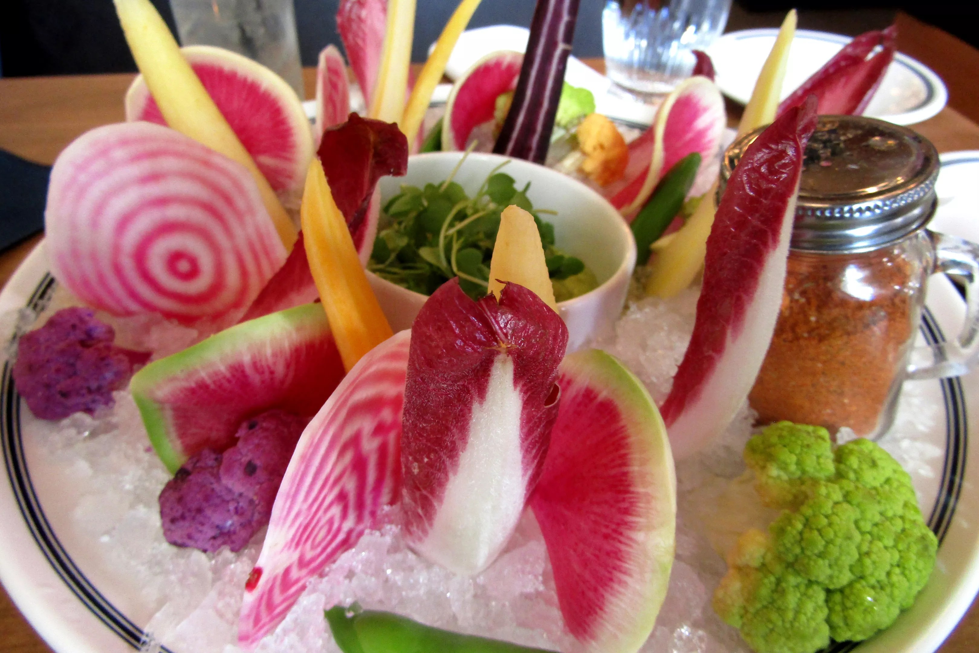 Other dishes get a dose of modernization, especially on the appetizer slate. A platter of crudités comes not as the standard pile of broccoli, celery and baby carrots, but rather as a bowl of crushed ice decorated with a forest of radicchio, endive and thin-sliced watermelon radishes and purple carrots, centered with a bowl of herbed hummus and a shaker of seasoning. And what modern menu would be complete without avocado toast?