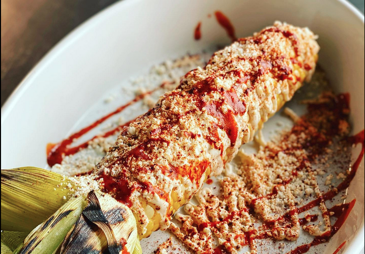 Elote, Mexican street corn made with mayonnaise and spices, is one dish on the menu at Linda Hermosa.