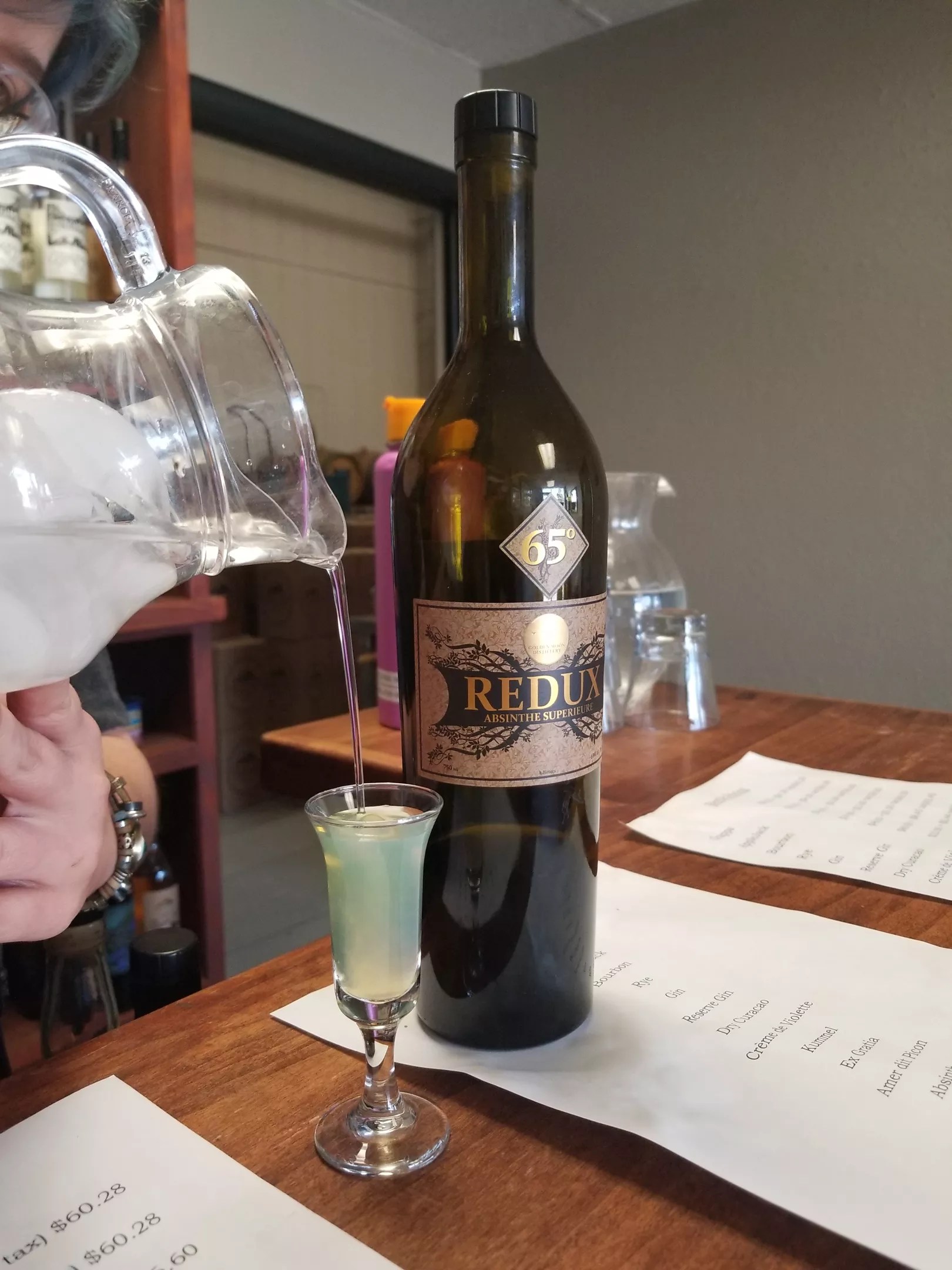 Save the absinthe for last. Golden Moon’s version contains contains wormwood, fennel and star anise. While I sampled in the tasting room, the heady scent of these botanicals wafted throughout the distillery from a batch of the spirit being made. When absinthe is diluted with ice water, the essential oils from the herbs separate from the alcohol, causing the liquor to become opalescent. This clouding effect is called louche, and it releases aromatic compounds exquisite to the nose and tastebuds. Veatch says that poor-quality absinthe doesn’t louche, only the good stuff. And Golden Moon absinthe is really good stuff.