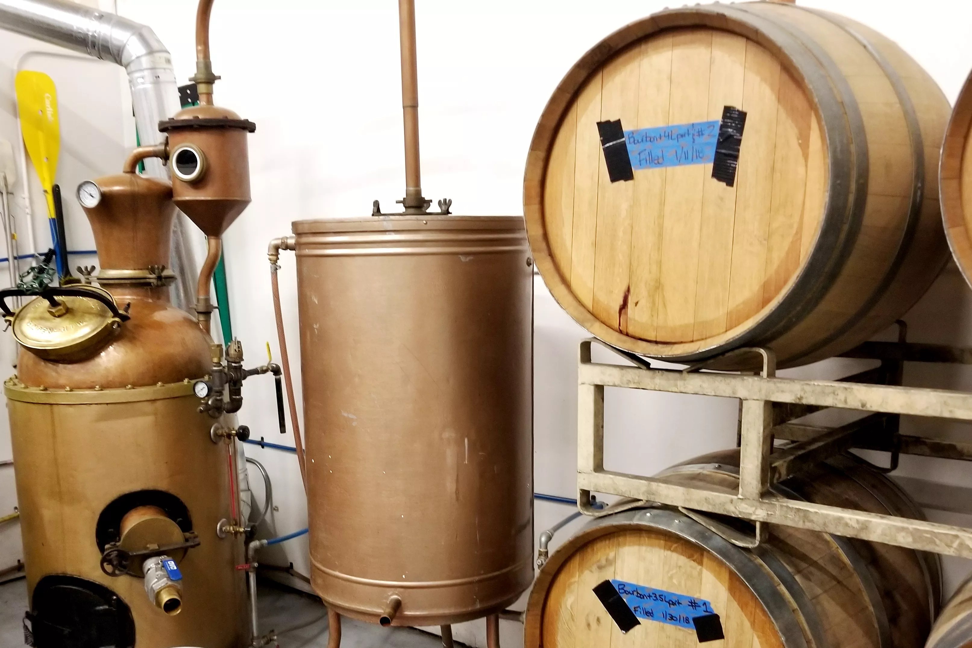A small part of Golden Moon’s distilling equipment and aging barrels.