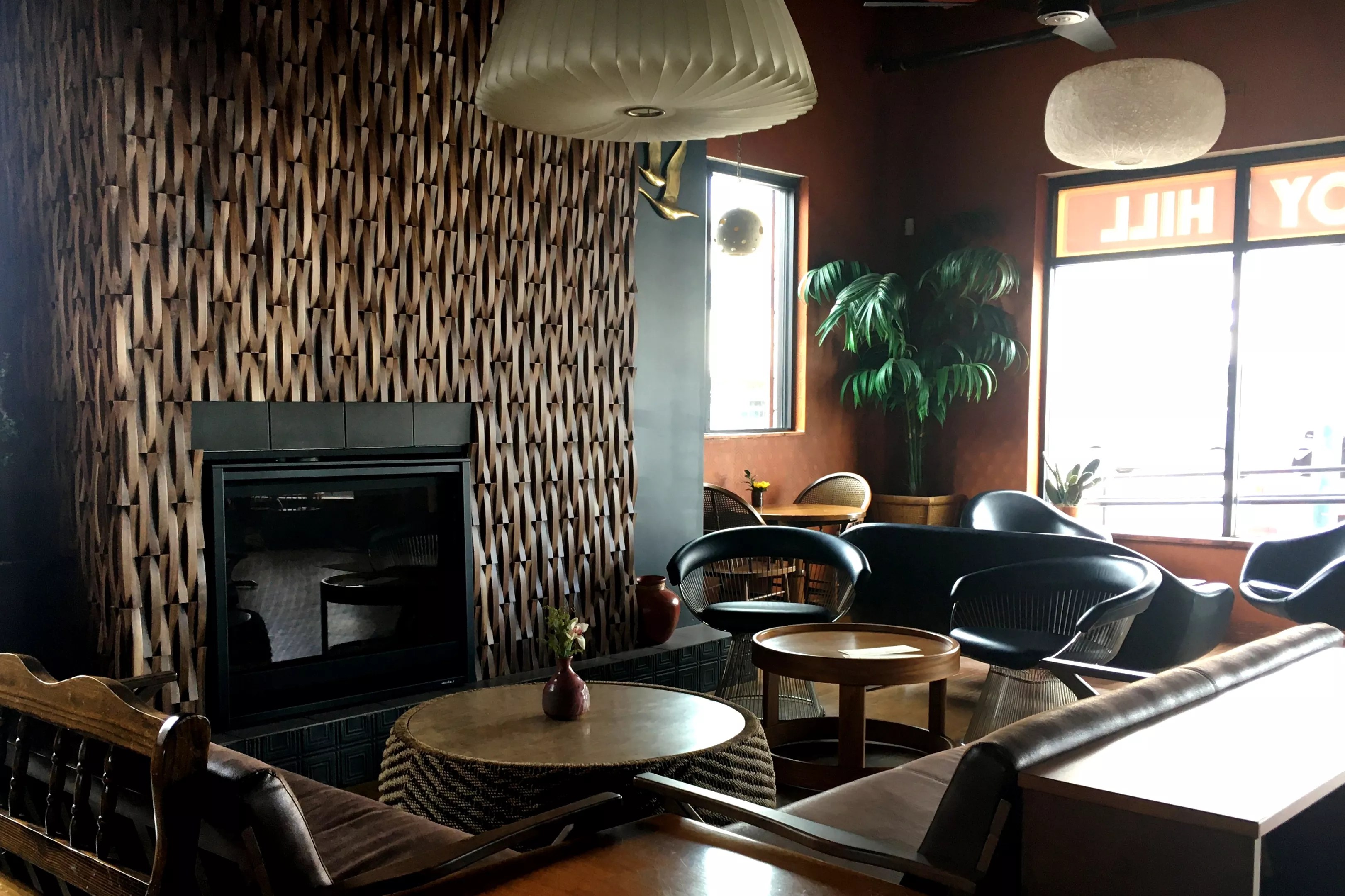 A fireplace and comfortable seating welcome guests at Joy Hill.
