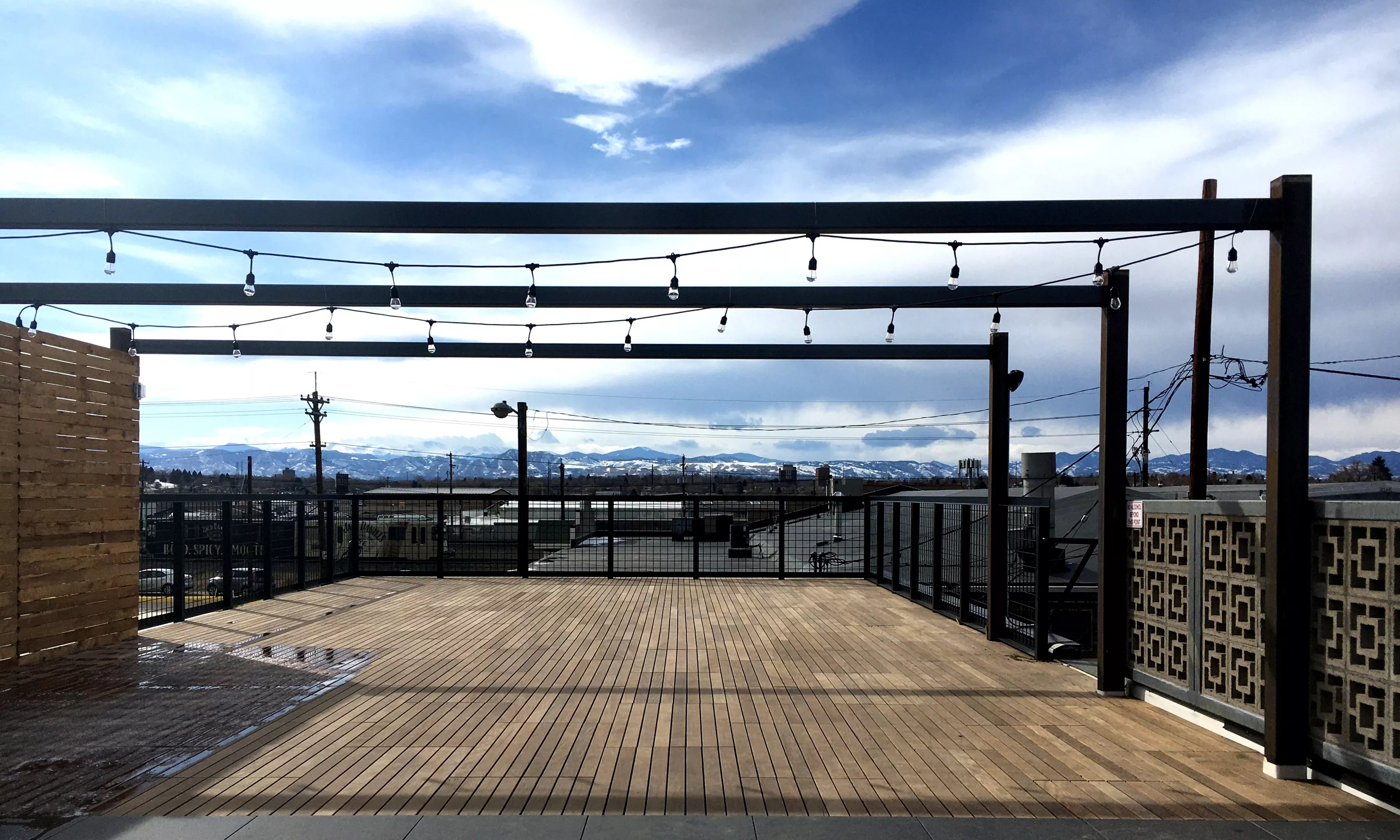 A spacious rooftop patio faces west from the back of Joy Hill.