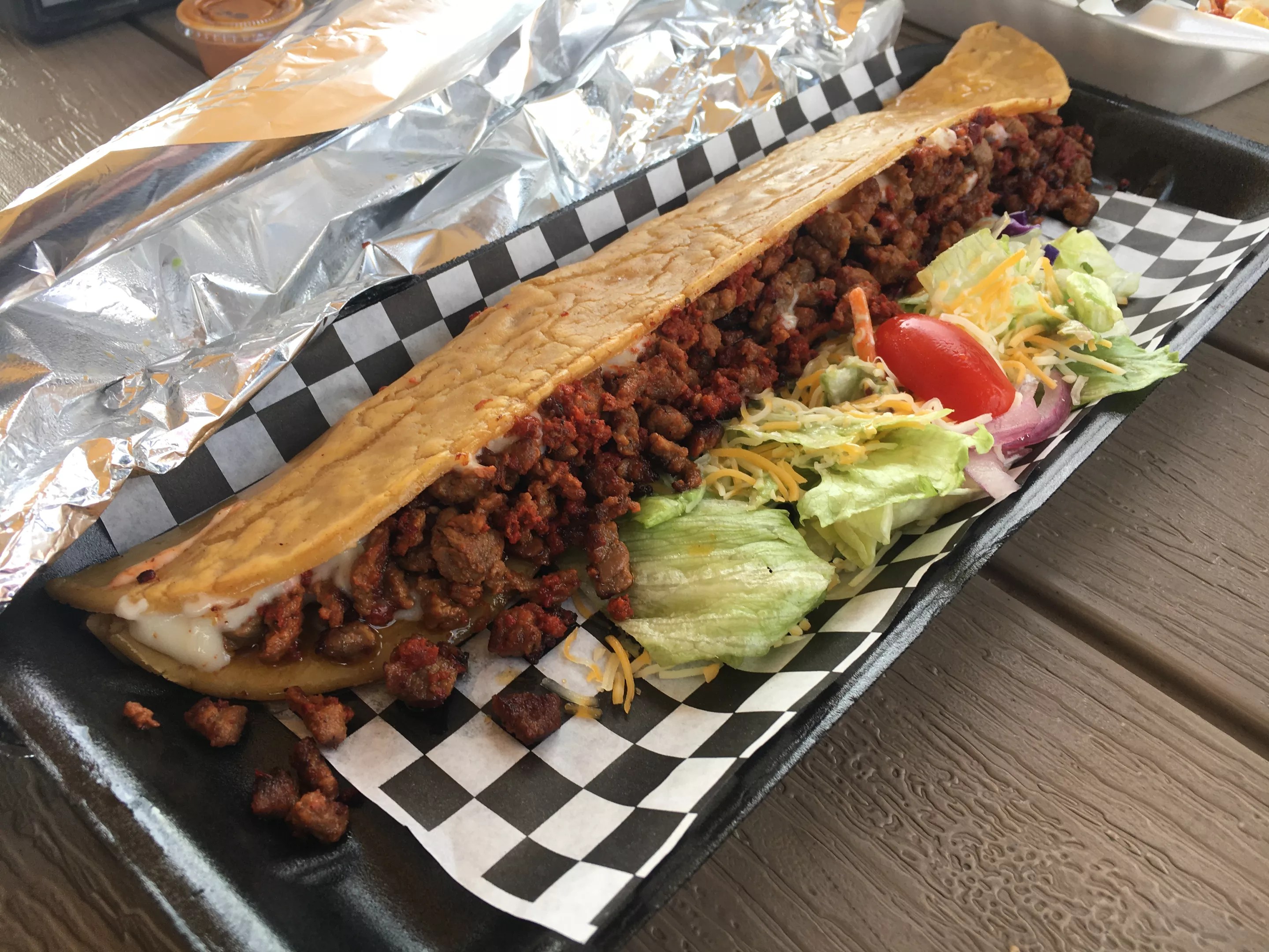 This extra-long taco is a machete from Tacos y Machetes La Carpa, a regular at La Esquina Del Sabor.