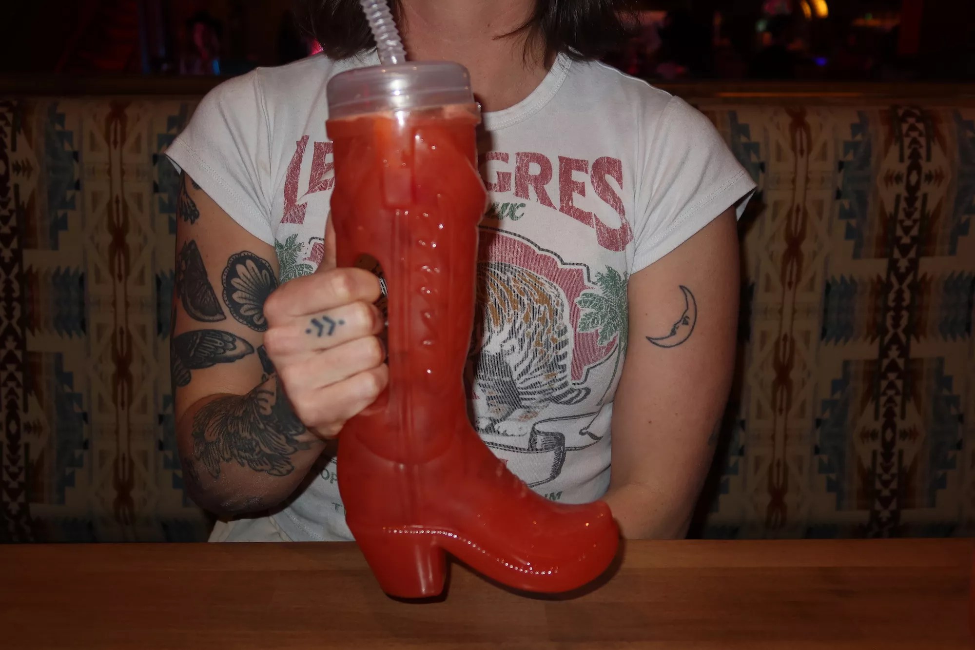 If you want to go big, the signature Belle’s Boots cocktail made with Captain Morgan white rum, sweet chile lime rum and coconut rum is served in a 30-ounce souvenir boot-shaped cup.