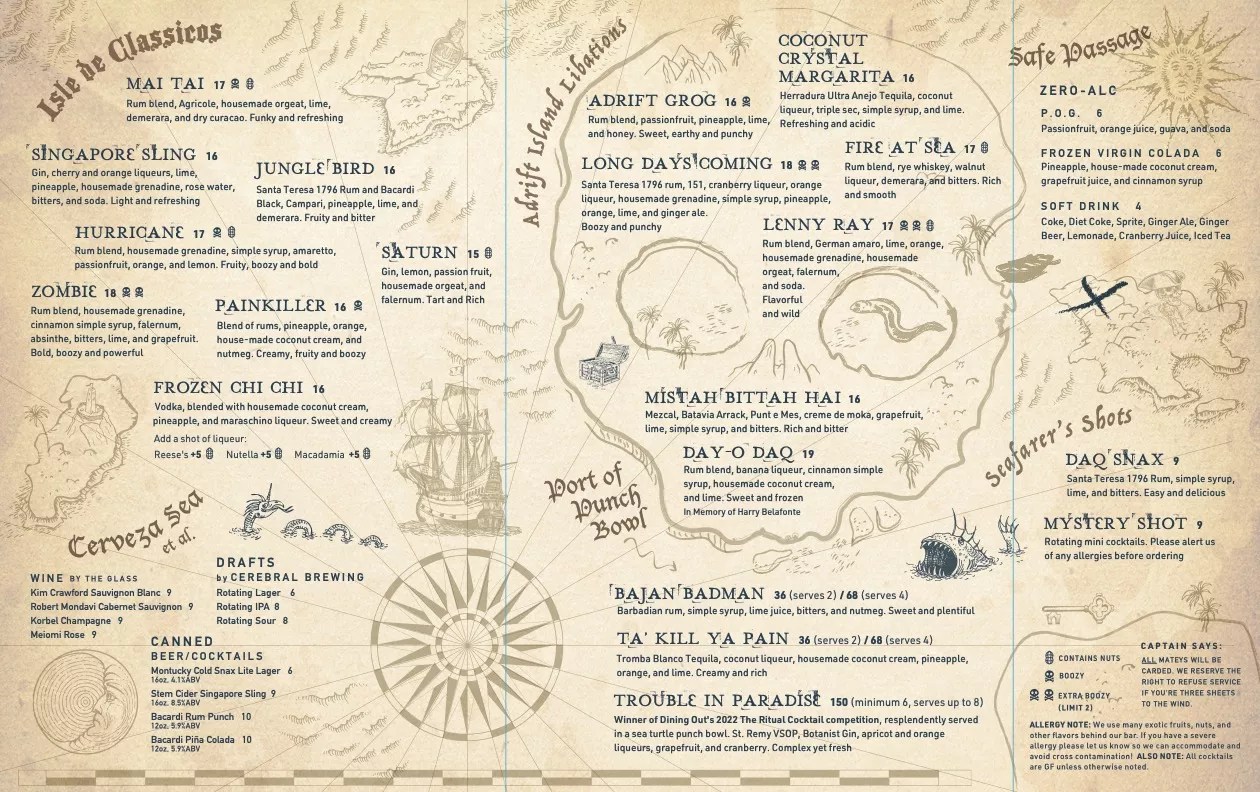 The bar worked with Orr Design to create a menu that looks like an old-fashioned treasure map, with its Singapore Sling and Mai Tai sitting on the “Isle de Classicos” while the Trouble in Paradise cocktail – winner of the 2022 Dining Out Ritual Cocktail competition – appears in the “Port of Punch Bowl.” The menus themselves look like, and have unintentionally become, keepsakes; laughing, Martinez admits that patrons often sneak them out of the bar.