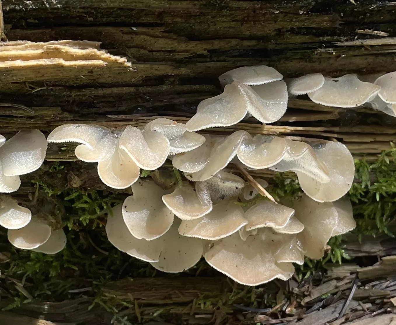 Toothed jelly fungus (Pseudohydnum gelatinosum) sprouts from rotting conifer wood during late summer and early fall in the mountains. The mushrooms are shiny and translucent, with little “teeth” beneath the cap. They’re edible, but not commonly eaten.