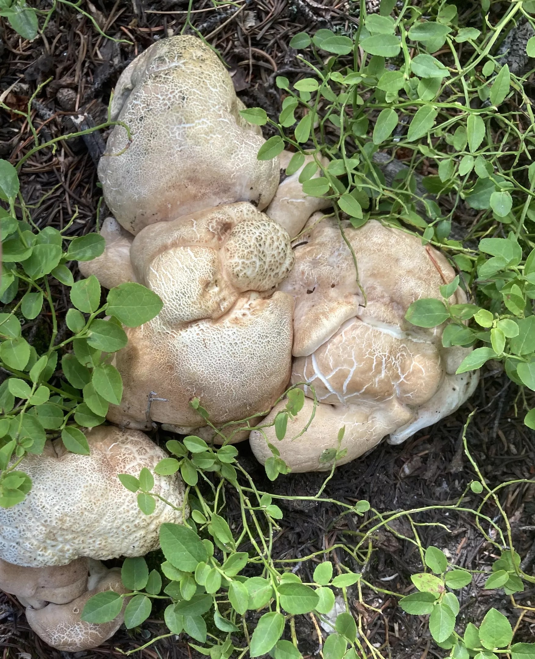 Albatrellus confluens currently lacks a common name and fruits in summer and fall in clumps under spruces and firs in the mountains. They’re edible if you get to them before the worms and mold do. Some folks report the flavor as unpleasant. Others (myself included) like them and actively seek them out.