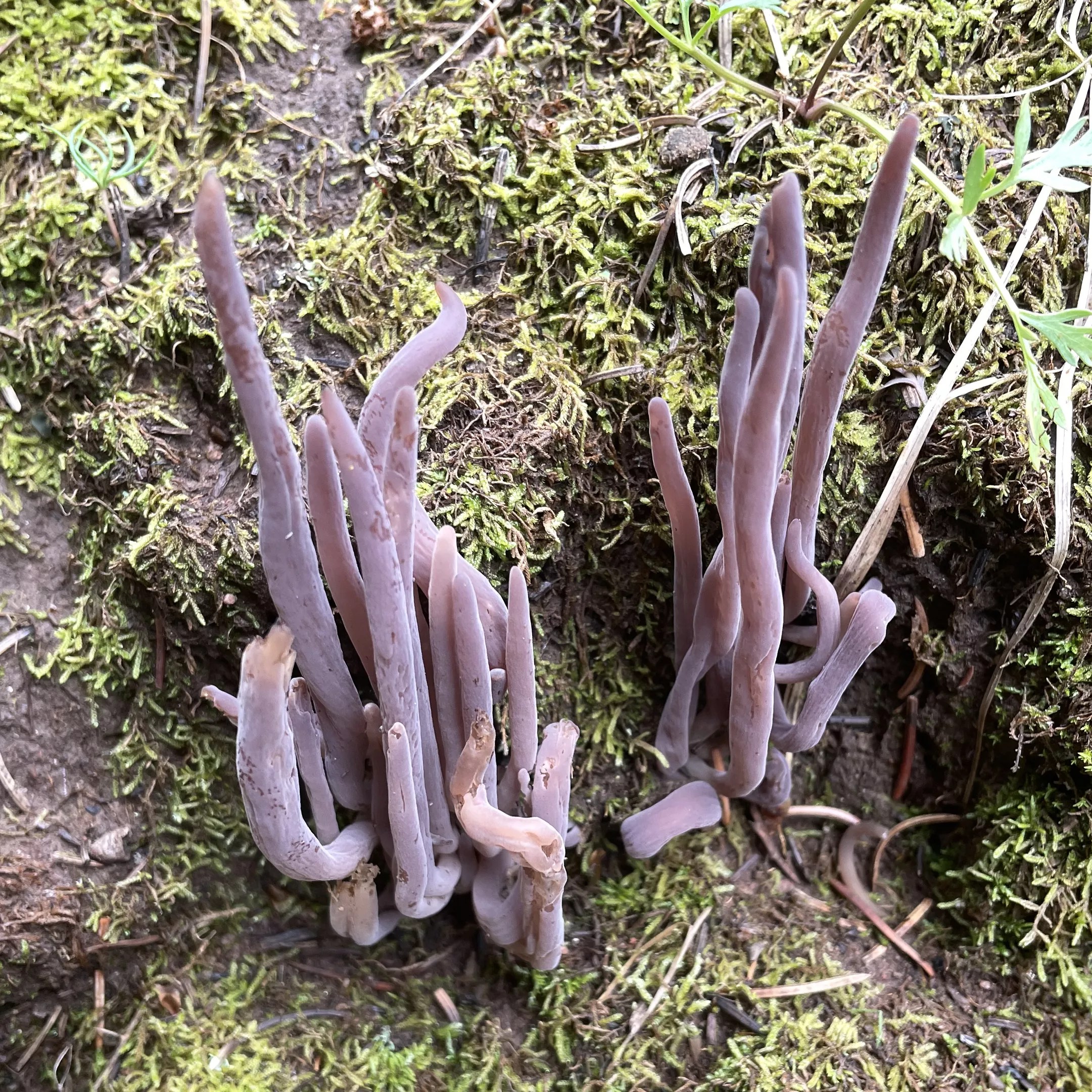 Purple fairy clubs (Alloclavaria purpurea) show up from summer into early fall in high-elevation conifer forests, often growing with mosses. Fairy clubs are fun to encounter and are edible; but it’s too insubstantial to bother harvesting.