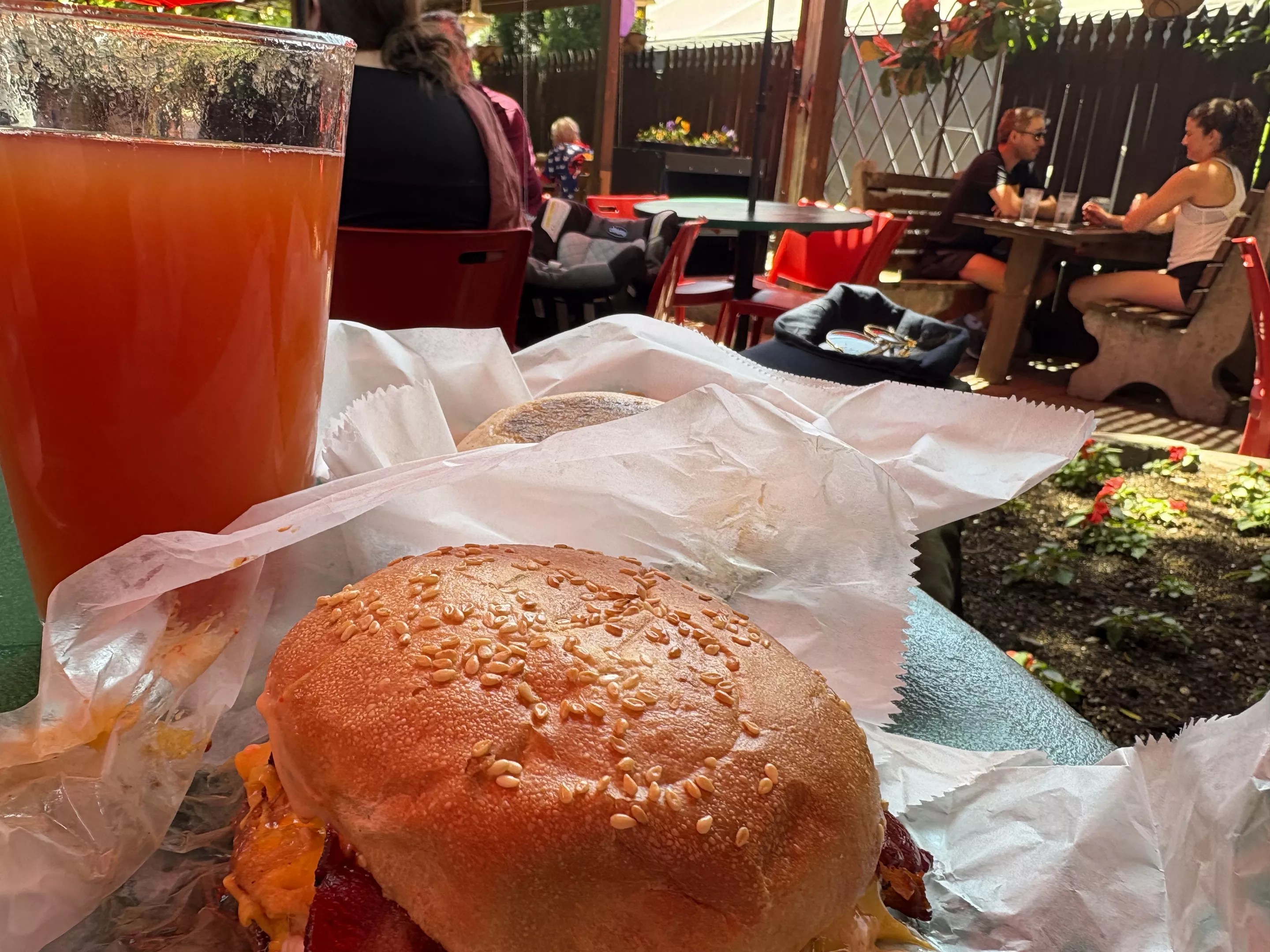 While the regular menu has evolved over the decades – there are vegetarian burgers now, as well as other non-burger options – Diaz won’t be changing that, Danny says. And as with every meal at My Brother’s, the brunch dishes come in baskets and/or on wax paper, without actual plates…but with those classic condiment trays that were made just for the bar decades ago, and which are kept carefully repaired since their creator passed on during the pandemic.
