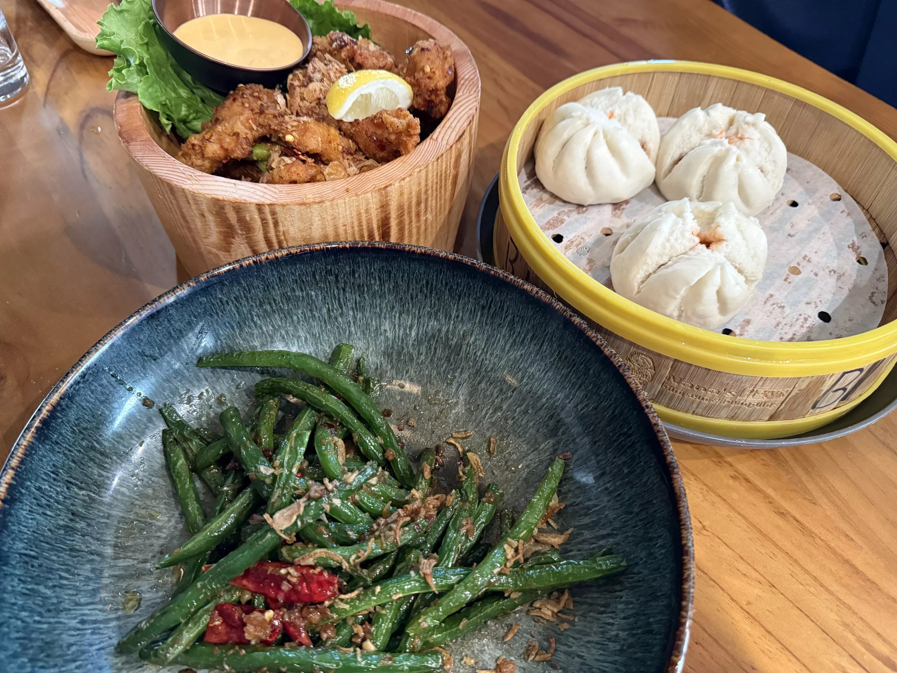 Small plates, with plenty to share. Clockwise from left: Szechuan chicken, BBQ buns, and stir fried beans.