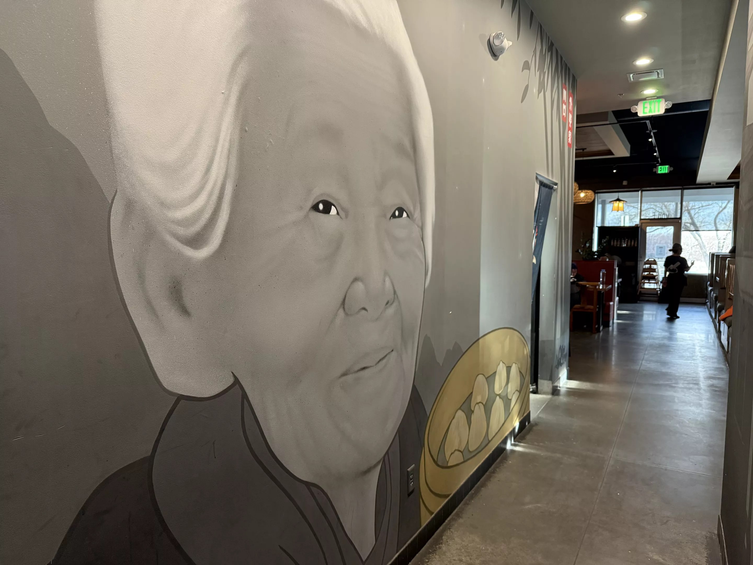Diners are immediately greeted by the titular Nana featured on the restaurant’s logo, who has a welcoming smile on her face and is holding a round bamboo steamer. She appears even more prominently along the restaurant’s back wall mural, with her kindly, wrinkled face painted floor to ceiling by local artist Casey Kawaguchi.
