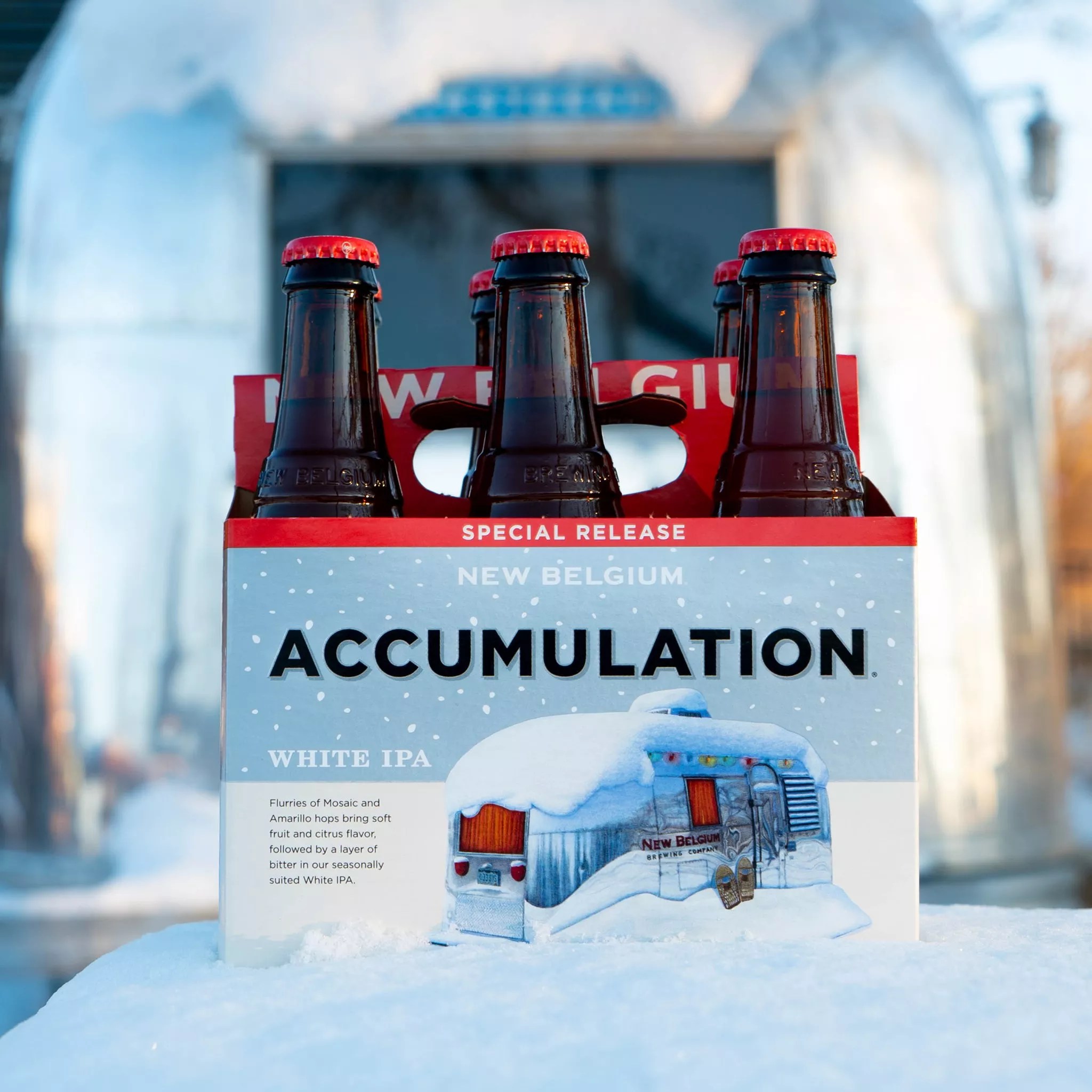 Accumulation itself was released for the first time in 2013 in bottles as a “white IPA,” which was a popular style at the time. It was a cloudy wheat-based beer with Mosaic and Amarillo hops, and the label featured the Fort Collins-based brewery’s Airstream trailer covered with snow. But the beer was rebranded this year as a more contemporary-sounding hazy winter IPA, and given a new logo and artwork.