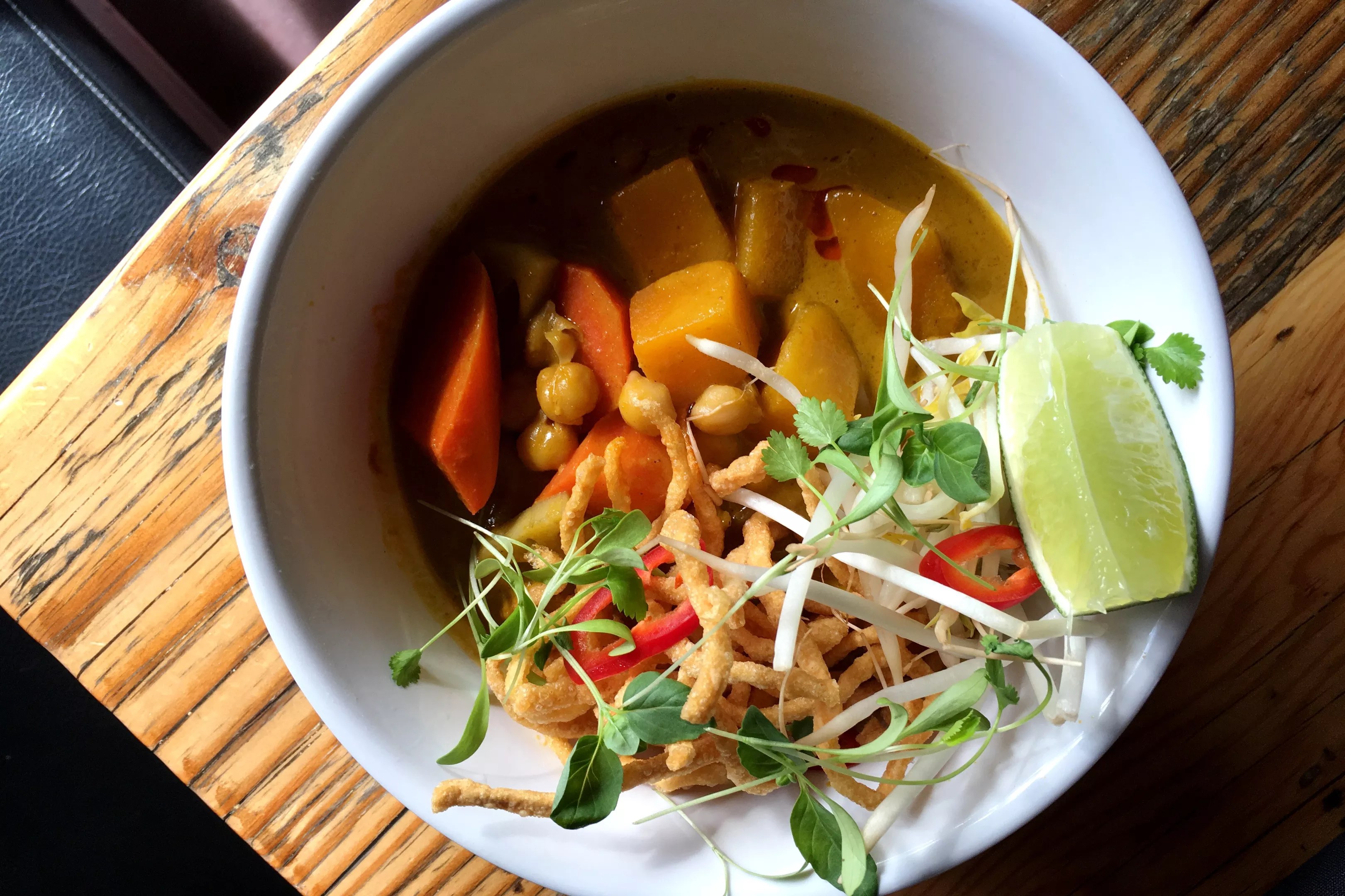 Other new items hop from China to Thailand to Japan. Housemade bao buns are stuffed with pork belly, short rib or tempura mushrooms; a Spice Market beef soup captures the best of ramen, pho and Chinese beef noodle soup; and a vegetarian kho soi takes the famed curry noodle soup of northern Thailand and replaces chicken with chickpeas and toothsome kabocha squash. Another veg-forward dish is the Jade Stir-Fry, which at this time of year comes with Swiss chard, lotus root and broccolini in a garlicky sauce.
