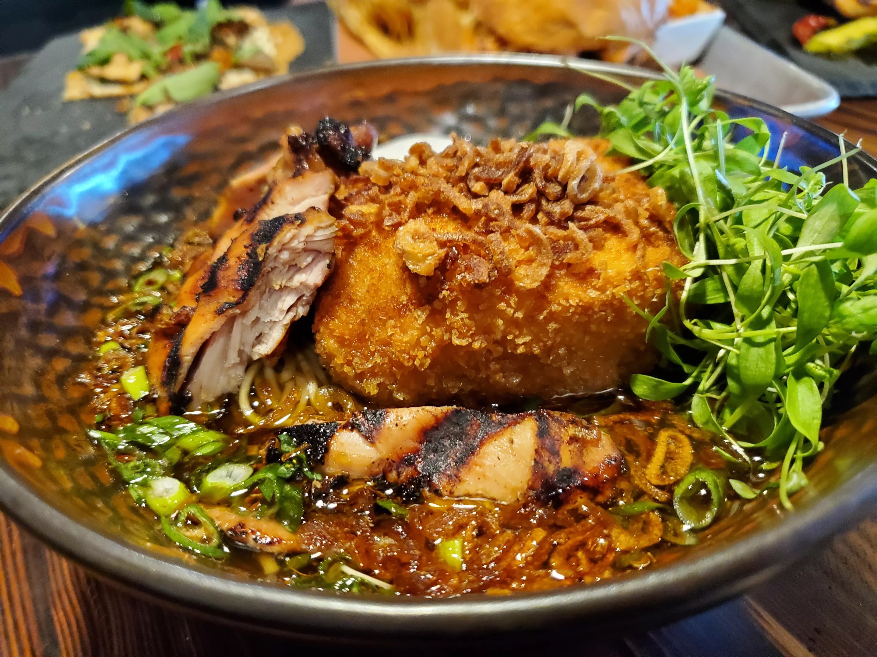 Traditions from different countries are blended in dishes like the ramen, which includes char siu chicken and a potato croquette. “I’ve always liked potato soup, and we have mashed potatoes on the menu, and I like making croquettes occasionally. So one day for lunch, we just did it, and it just worked,” Navratil says.