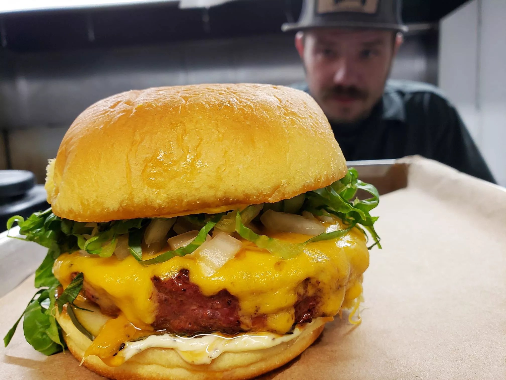 Christopher Nicki sizes up his smoked cheeseburger at Hank’s.
