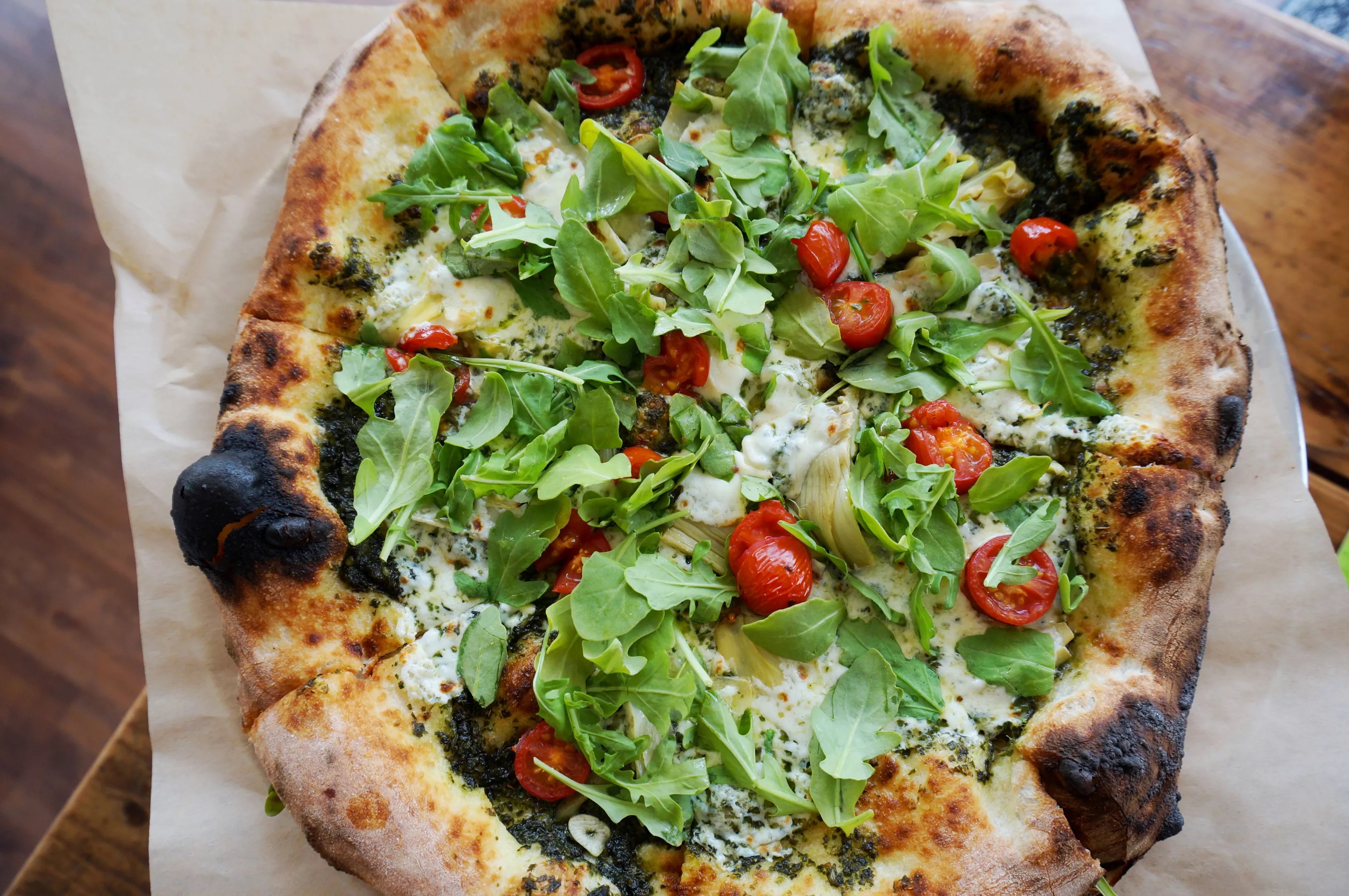 The “Lawn Boy” pizza with arugula, tomatoes, Parmesan, fresh mozzarella, artichoke, garlic and pesto.