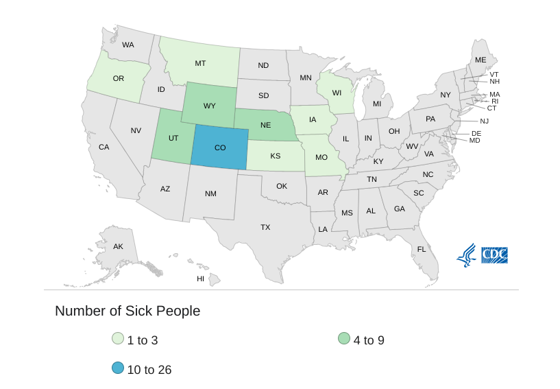 Most people recover in around a week with treatment. According to the CDC, because not every person who gets sick will report to doctors, more cases connected to the outbreak are likely unreported. While Colorado is the leading state in cases now, the CDC says there may be more states that are impacted.