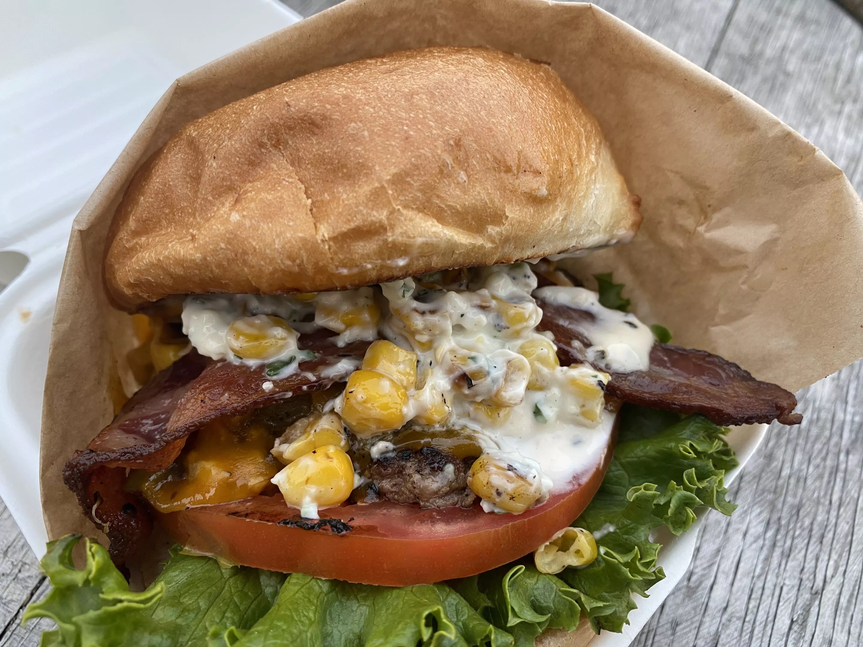 The Route 66 Burger, with street corn, Hatch green chiles, garlic aioli, lettuce and tomato (bacon optional).