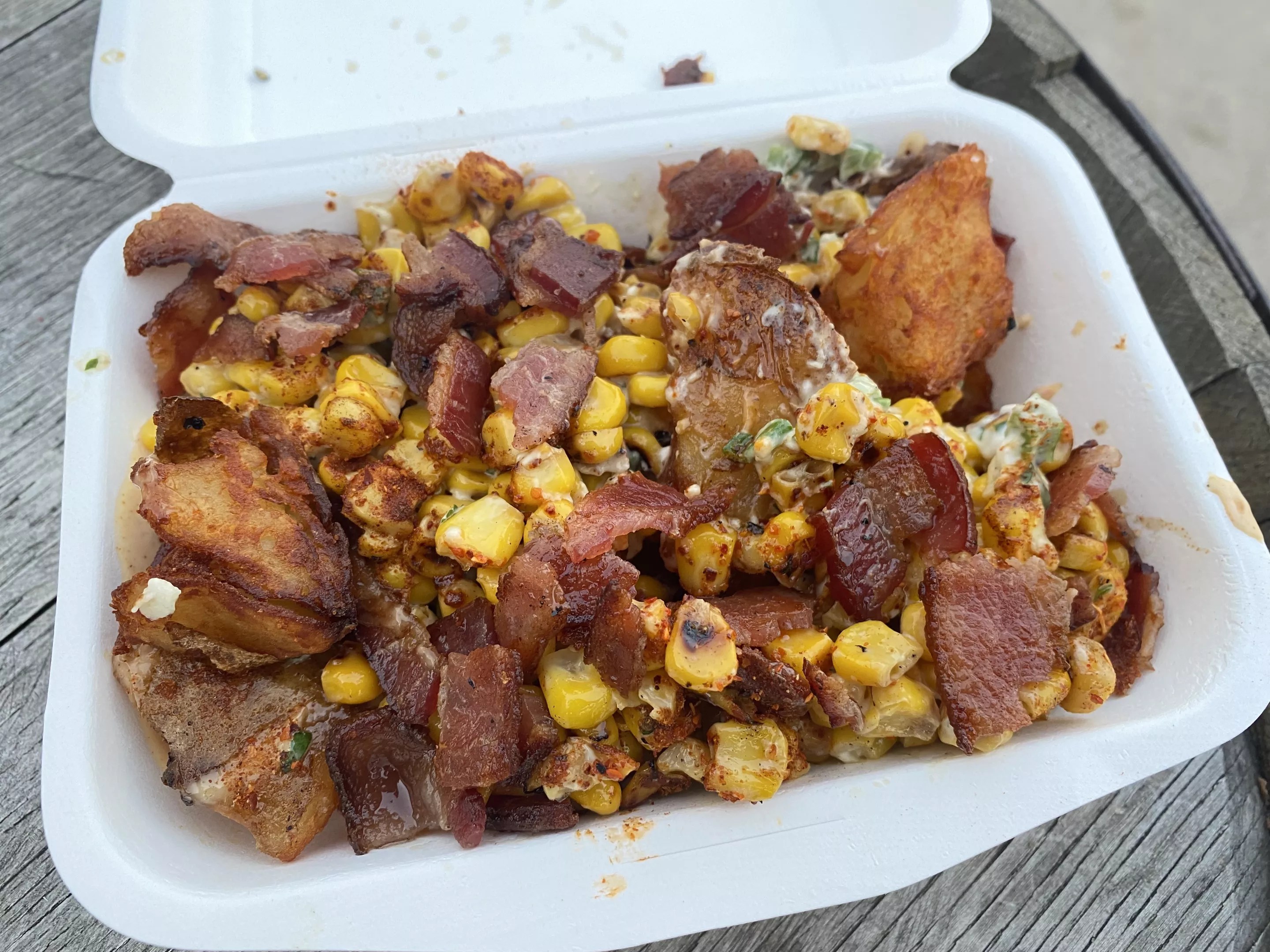 Loaded Russets are piled with street corn, bacon and special sauce.
