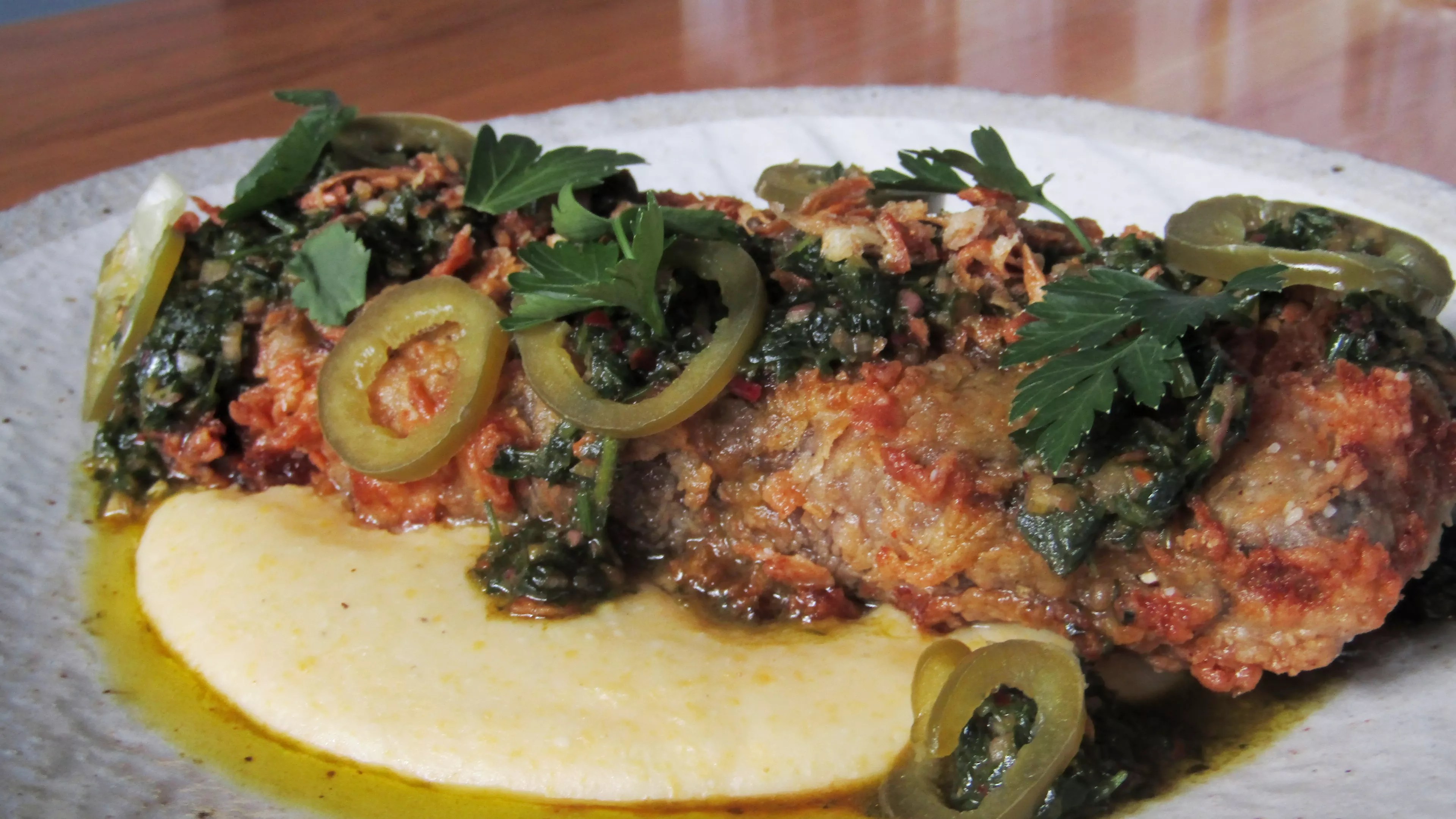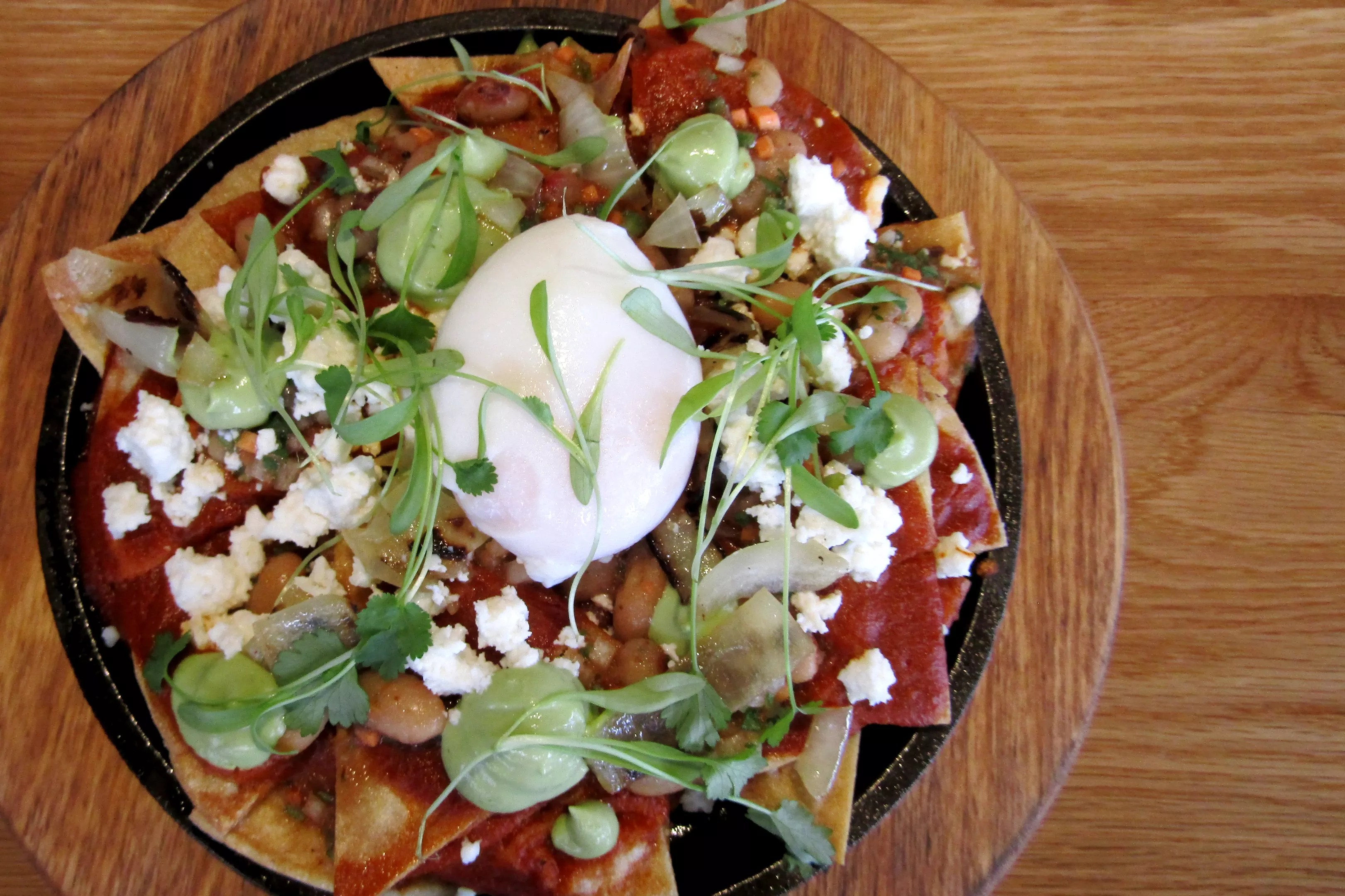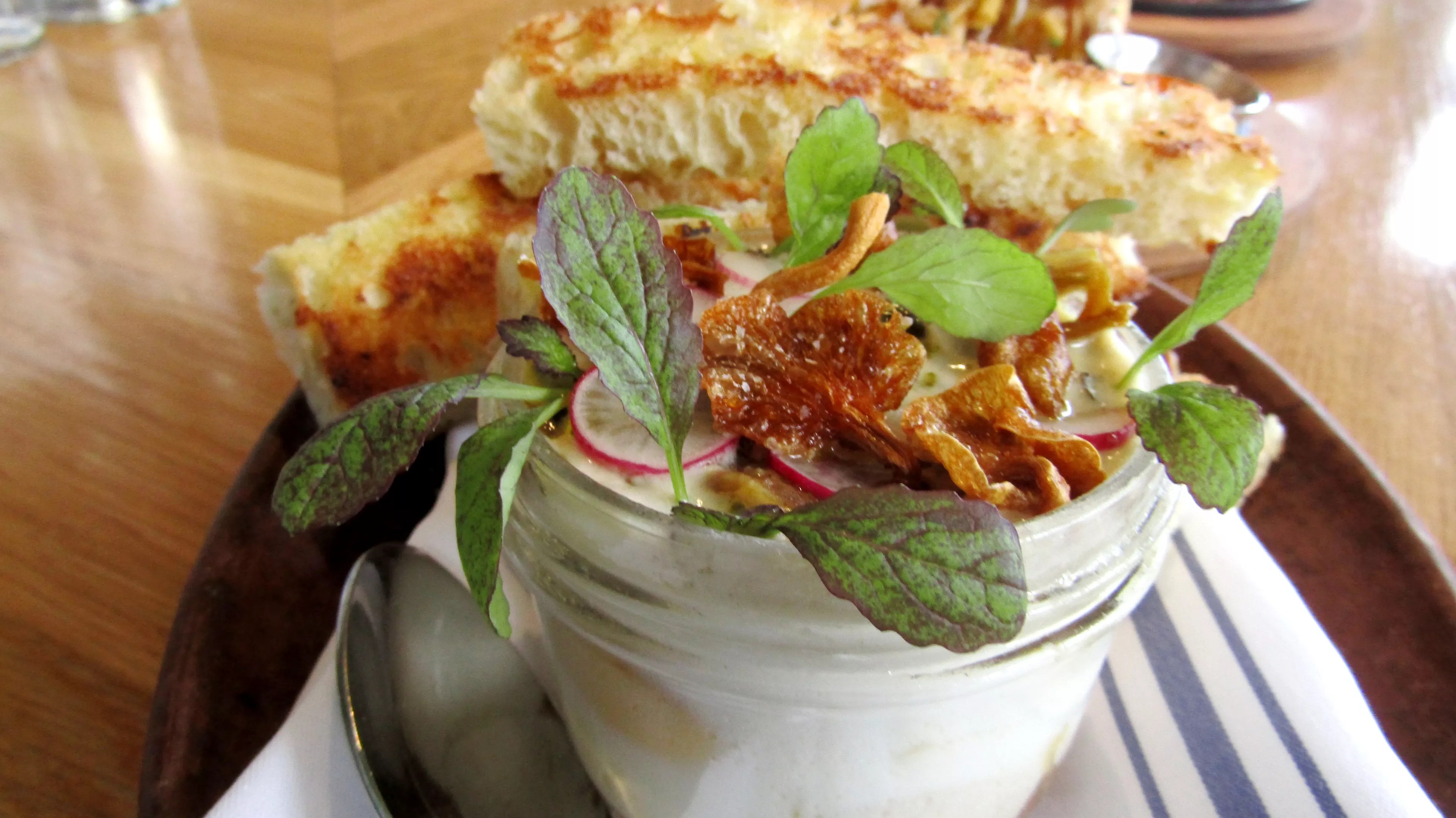 Perhaps the most impressive, if least brunchy, item on the new menu is the chicken-fried steak, which isn’t steak at all, but rather an imposing brick of beef short rib cooked until it’s fork-shreddable, then further breaded and fried. A bright-green ribbon of piquant chimichurri sauce and a pool of cheesy grits round out the dish. Other brunch options include an acai bowl, chilaquiles, a coddled egg (a soft egg cooked in a jar) with bacon jam and grilled bread, and fries dressed with crispy pig ears and aji soy butter round out the roster.