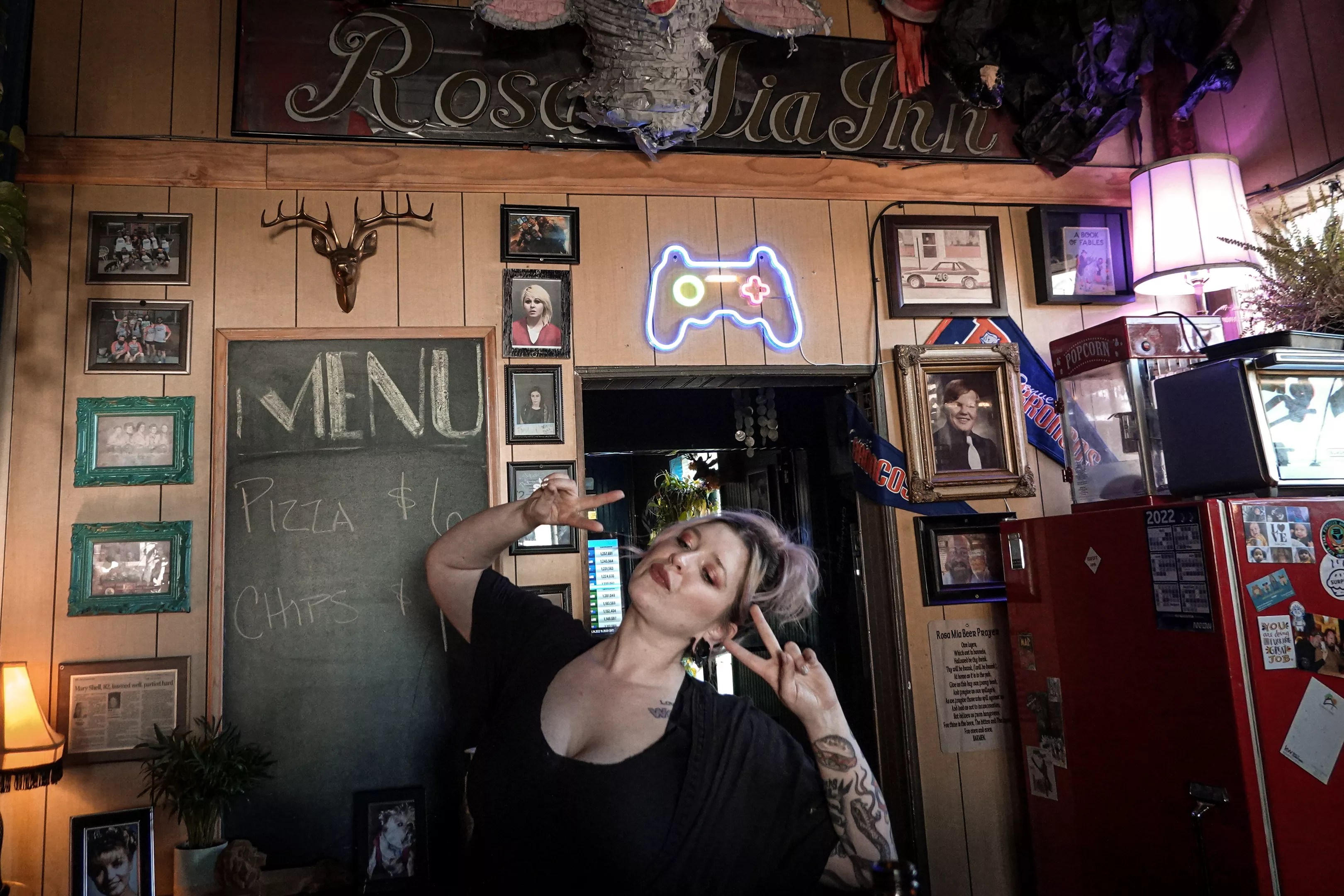 On occasion, he also drops into Crow Bar, an oasis established in 1966 on the border of Berkeley and Mountain View. Looking east, you see the creeping shadows of apartment buildings, condos and inevitability lurching toward the dive formerly known as the Rosa Mia Inn. The cozy front room gives off eccentric-grandma vibes, with pothos vines and kitschy crow “art” in mismatched frames adorning the walls, while the back is all dorm-core, with a Super Nintendo and an old Austin Powers pinball machine that loves to ask, “Do I make you randy?”