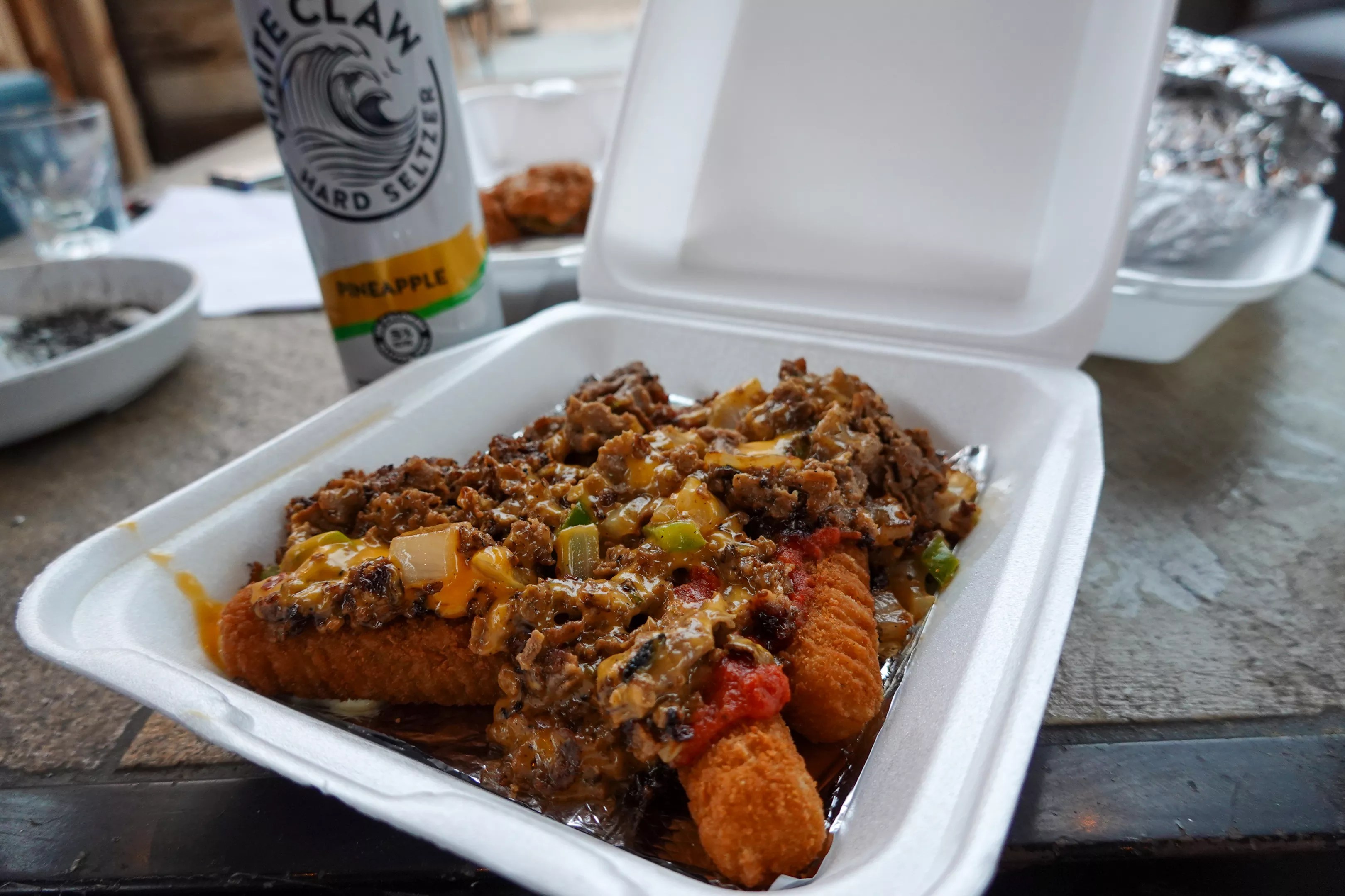 Cheesesteak served over nachos from the Good Eatz truck outside EastFax.