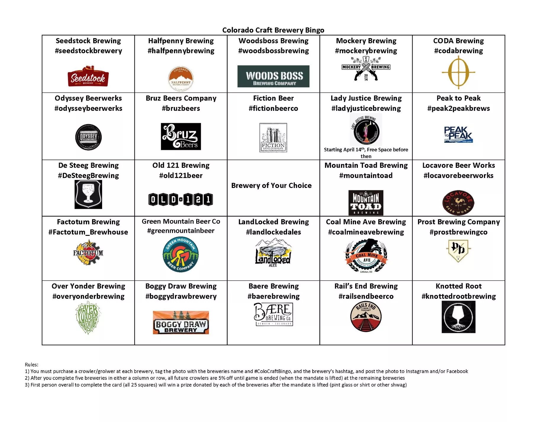 After Colorado’s breweries were closed for on-site drinking – the primary way that many of them make money – the owner of yeast supplier Propagate Lab jumped into action to create the Colorado Craft Brewery Bingo card. The newest iteration of the card lists 24 breweries; buy one or more Crowler from each of the five breweries in a row (horizontal, vertical, diagonal), and get 5 percent off each future Crowler from the rest of the participating breweries. Guests are encouraged to take a photo at each brewery, use the hashtag #ColoradoCraftBingo and post to Facebook or Instagram. The first person to hit every brewery gets a free piece of merch (T-shirts, hat, etc.) from each of the participating 24 breweries. Bingo sheets can be picked up at any of the participating breweries: Seedstock Brewery, Baere Brewing, Lady Justice, Bruz Beers, De Steeg Brewing, Odyssey Beerwerks, Factotum Brewhouse, Prost Brewing, Locavore Beer Works, Fiction Beer, Mockery Brewing, Woods Boss Brewing, Halfpenny Brewing, Old 121 Brewing, Over Yonder Brewing, Boggy Draw Brewing, LandLocked Brewing, Mountain Toad Brewing, Coal Mine Ave. Brewing, Rail’s End Brewing, CODA Brewing, Peak to Peak Brews and Knotted Root Brewing.