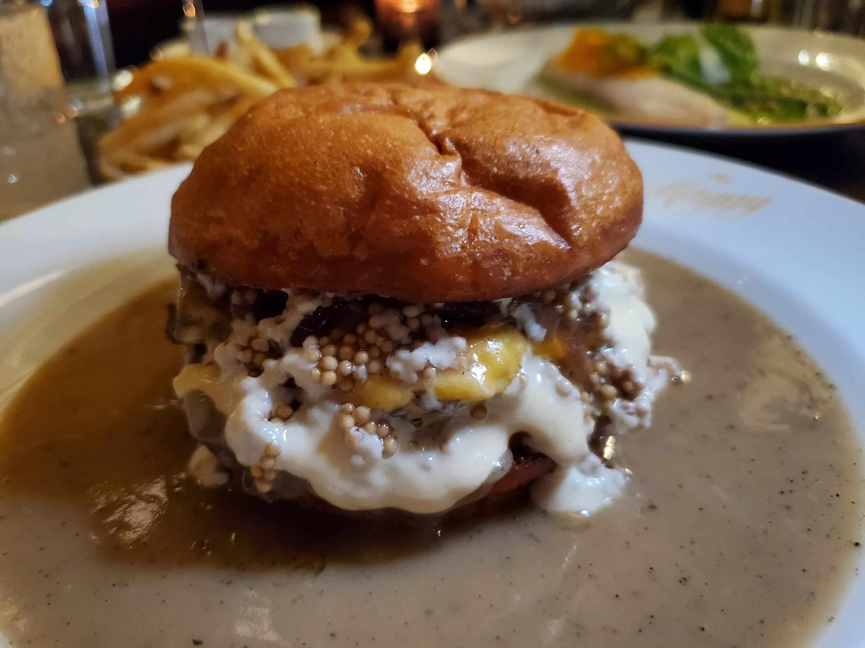 When I spoke to chef Ludo Lefebvre last fall about his plans for Chez Maggy, the restaurant he opened inside the new Thompson Hotel on Market Street, he promised a “kick-ass” burger. And while I’m still on the fence about a hamburger that you must eat with a fork and a knife, this burger is definitely the most decadent in town. At $28 (without fries), it may also be the most expensive, but the combination of American cheese, pickled mustard seeds, smoked mayo and beer-braised onions piled on a big burger that’s literally swimming in pepper gravy indeed kicks ass.