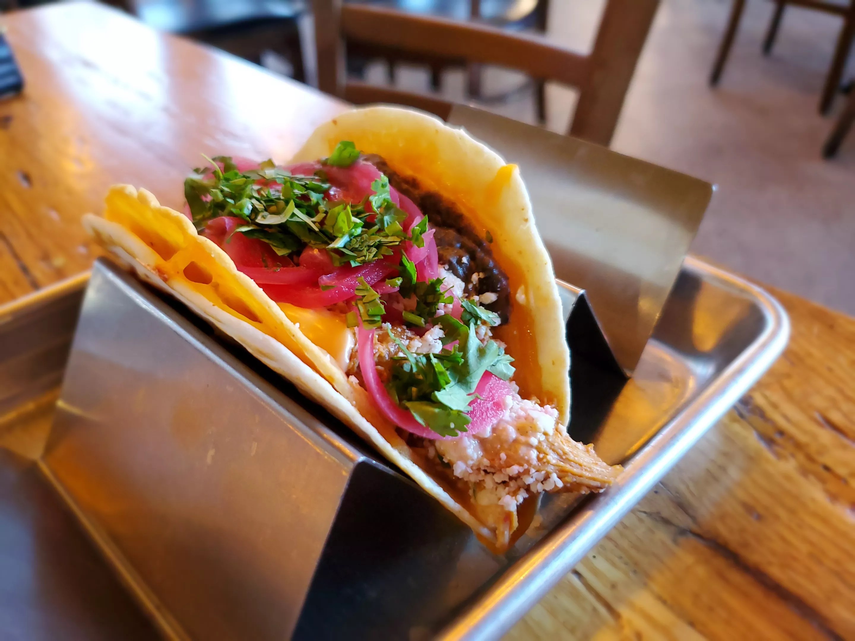 Street Feud, which opened in December at 5410 East Colfax Avenue, in the former home of Hank’s Texas Barbecue and Solera, is a retro dream. The walls are plastered with throwback magazines and street art-inspired touches, and the playlist is packed with old school hip-hop favorites. The food is playful, too. One of chef/owner Merlin Verrier’s newest creations is a play on “some trashy fast food concept,” according to an Instagram post. The 2 Shells 1 is a flour and a corn tortilla loaded with cheese, chicken tinga, huitlacoche beans, pickled onions and Becky Sauce (don’t worry about what it contains; you’ll love it).