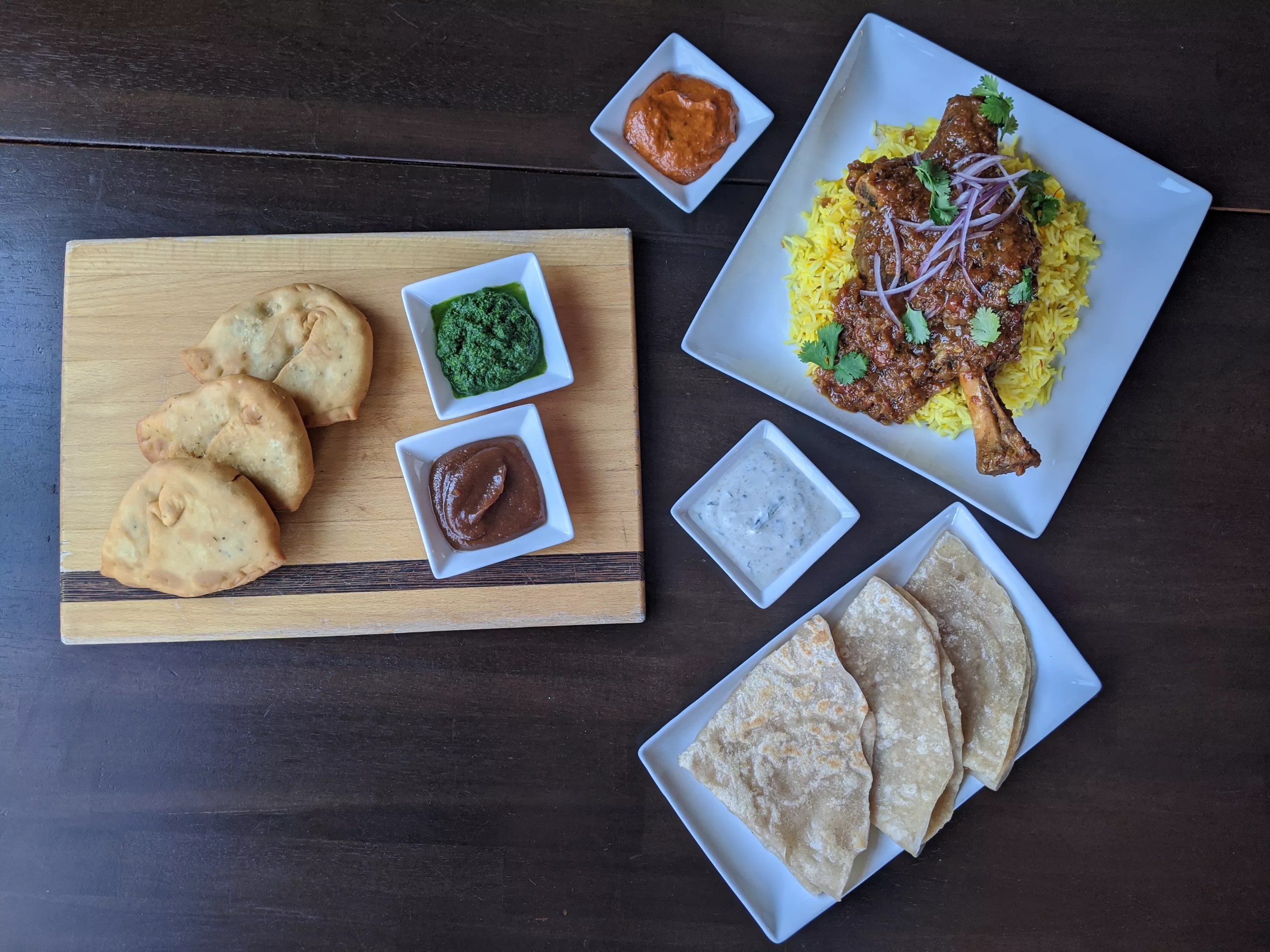 And a new dish, a sixteen- to eighteen-ounce braised Colorado lamb shank served with rice, roti, raita, pickles and chutneys, will be available for guests dining at the restaurant or ordering to go. The dish is built for two or three people for $52.