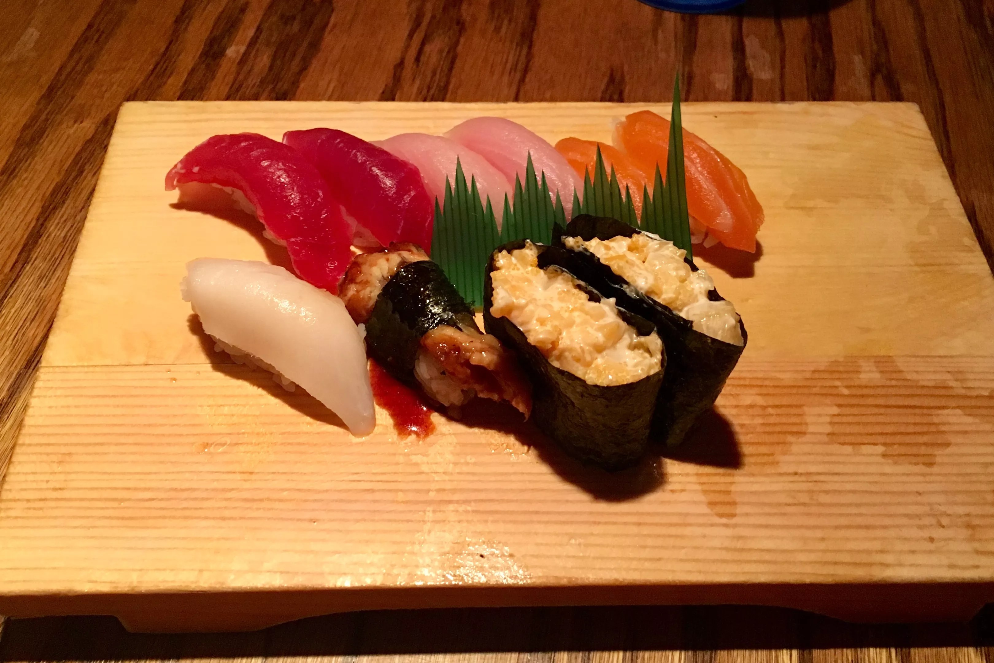 The bay scallop nigiri was soft and supple and just a touch sweet. The Katsu roll packed a hefty amount of fish: tuna, salmon, imitation crab meat and tempura shrimp, while the calamari roll came on the same plate and looked similar, but was less impressive, with just fried calamari, lettuce and cucumber inside. The chefs were heavy-handed with the brown sticky sauce, as it seemed to accompany nearly everything, which resulted in a uniform taste among all the rolls I tried. Imitation crab was also present in most of the rolls and appetizers, not unexpected considering the low prices of an all-you-can-eat sushi restaurant.