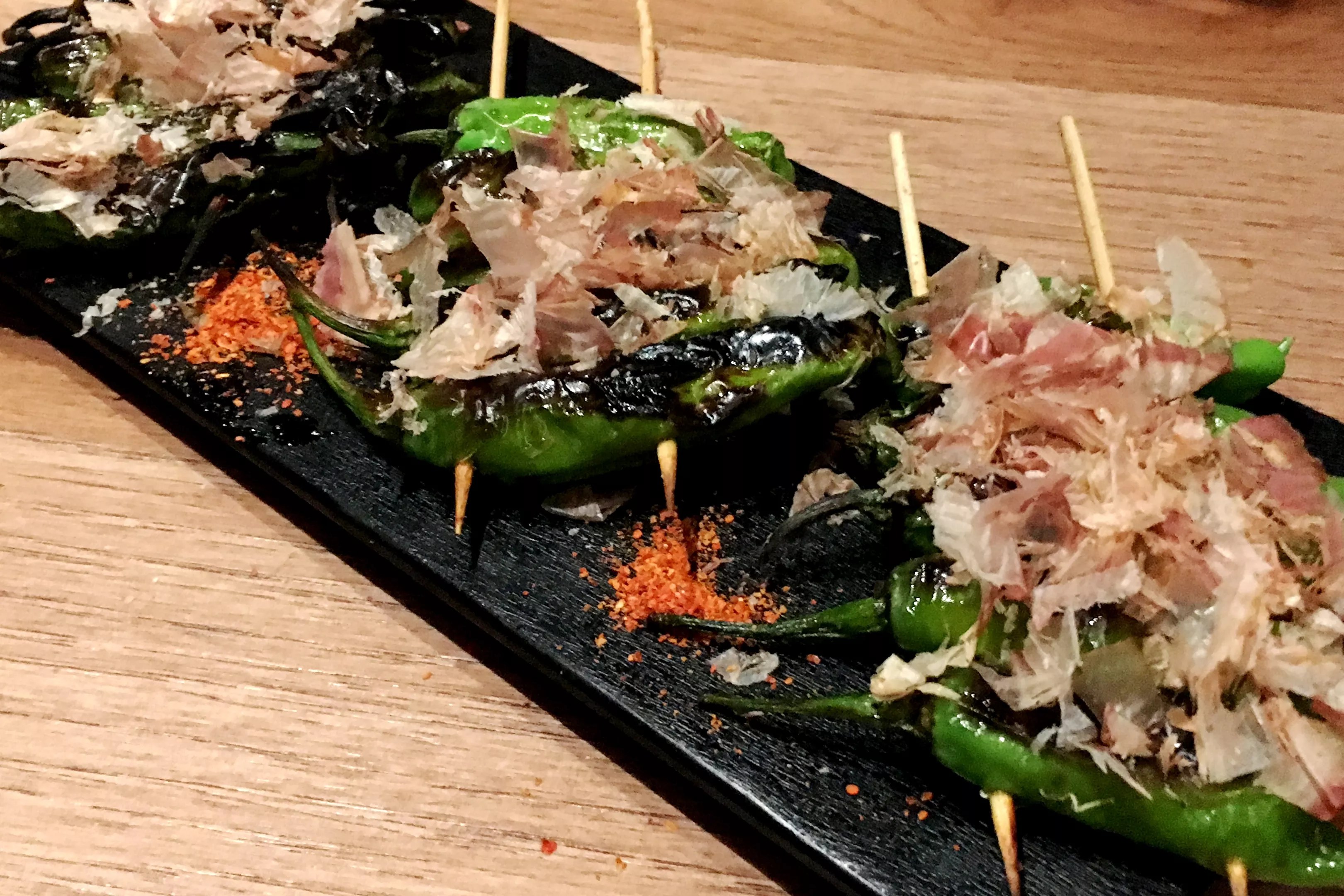 The robotayaki skewers are cooked over Japanese white oak charcoal, adding a char-grilled flavor to veggies – okra, shishito peppers and king trumpet mushrooms, for example – and meats, which also include shrimp, skirt steak and several different types of chicken. A few culinary terms to watch for: tare, a word for a sauce generally used for glazing skewers while they cook or for dipping once the food arrives at your table; yuzu kosho, a pungent paste made with citrus, chiles and salt; and furikake, a seasoning sprinkled over rice, fish or other mild dishes. Those pale-pink flakes atop your shishito peppers? They’re bonito flakes (or katsuobushi), made from tuna that has been cured and smoked until it’s so dry that it can be shaved over food to add savory, smoky flavor. You’ll also see it topping takoyaki, fried spheres of batter filled with diced octopus.