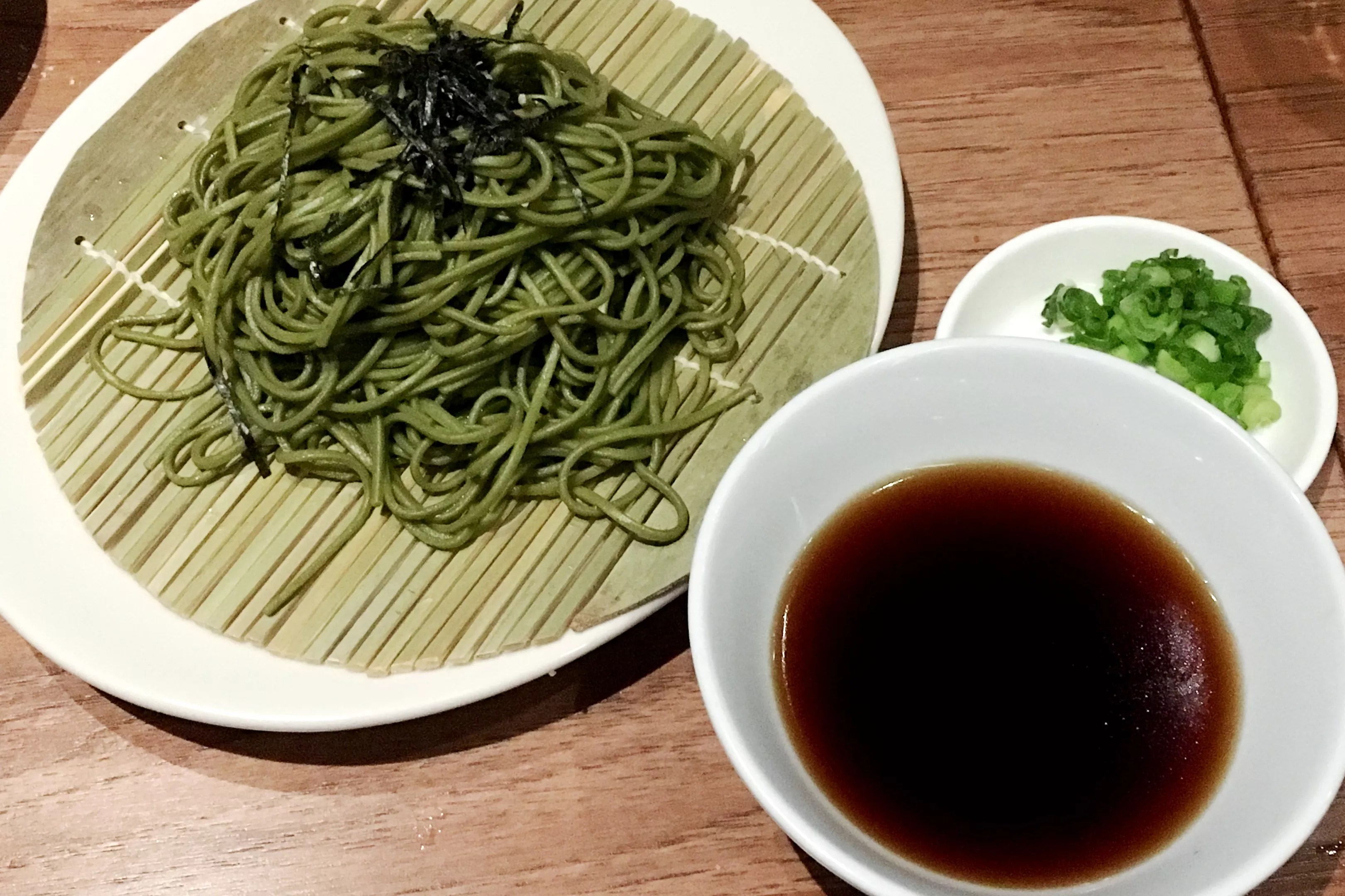 Matcha soba noodles are made with buckwheat flour and green tea powder.