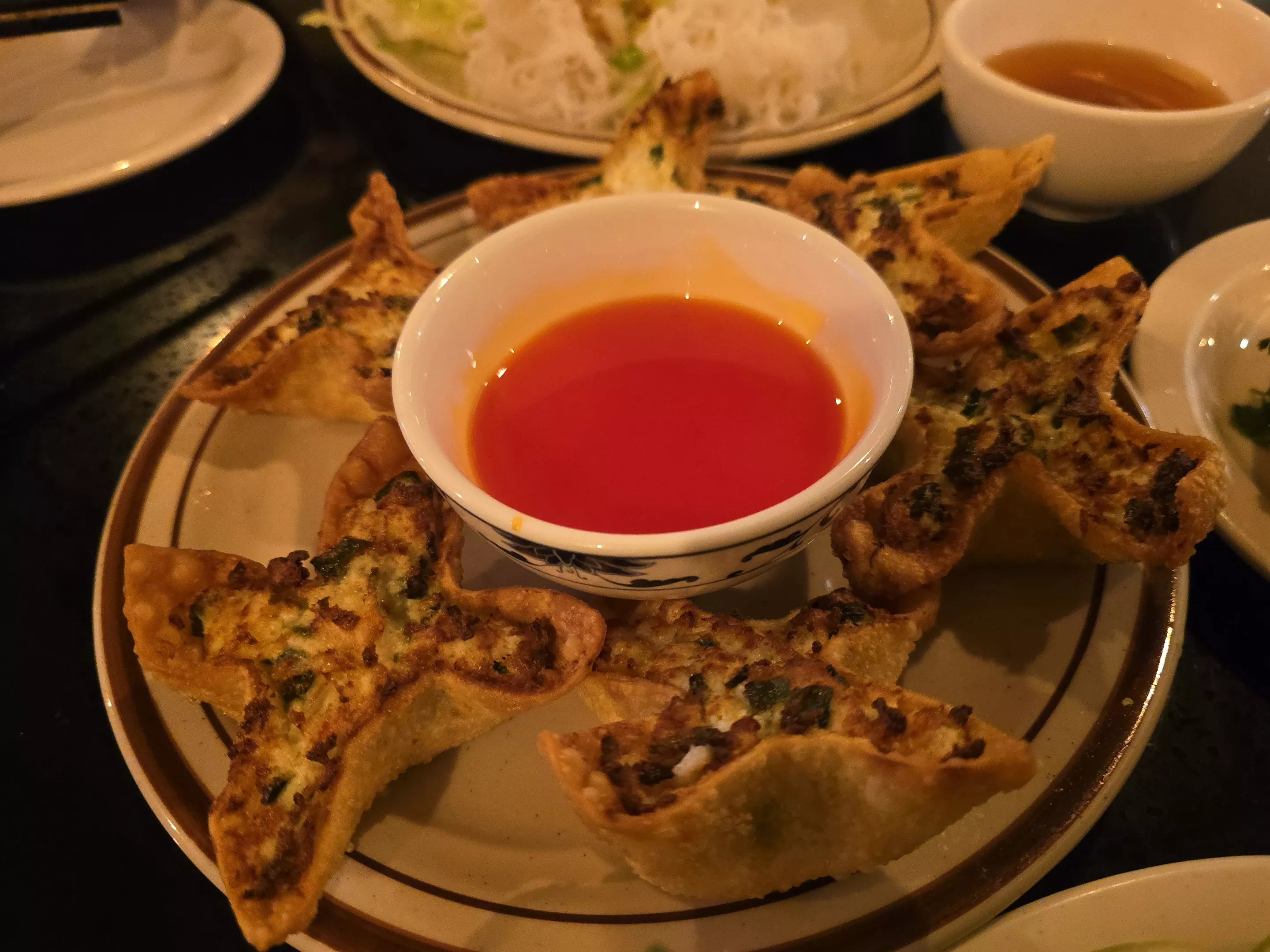 I have been on a crab cheese wonton kick lately, and recently found one that stands out from the rest. I visited Pho Peoria on a snowy night and was immediately impressed by its crab cheese wontons, bursting with filling and slightly charred on top. There’s no shortage of crab here, and the addition of scallions to the cream cheese mix offered a bit of freshness. The cinnamon-heavy pho broth was a pleasant treat, too, as were crispy fried egg rolls.