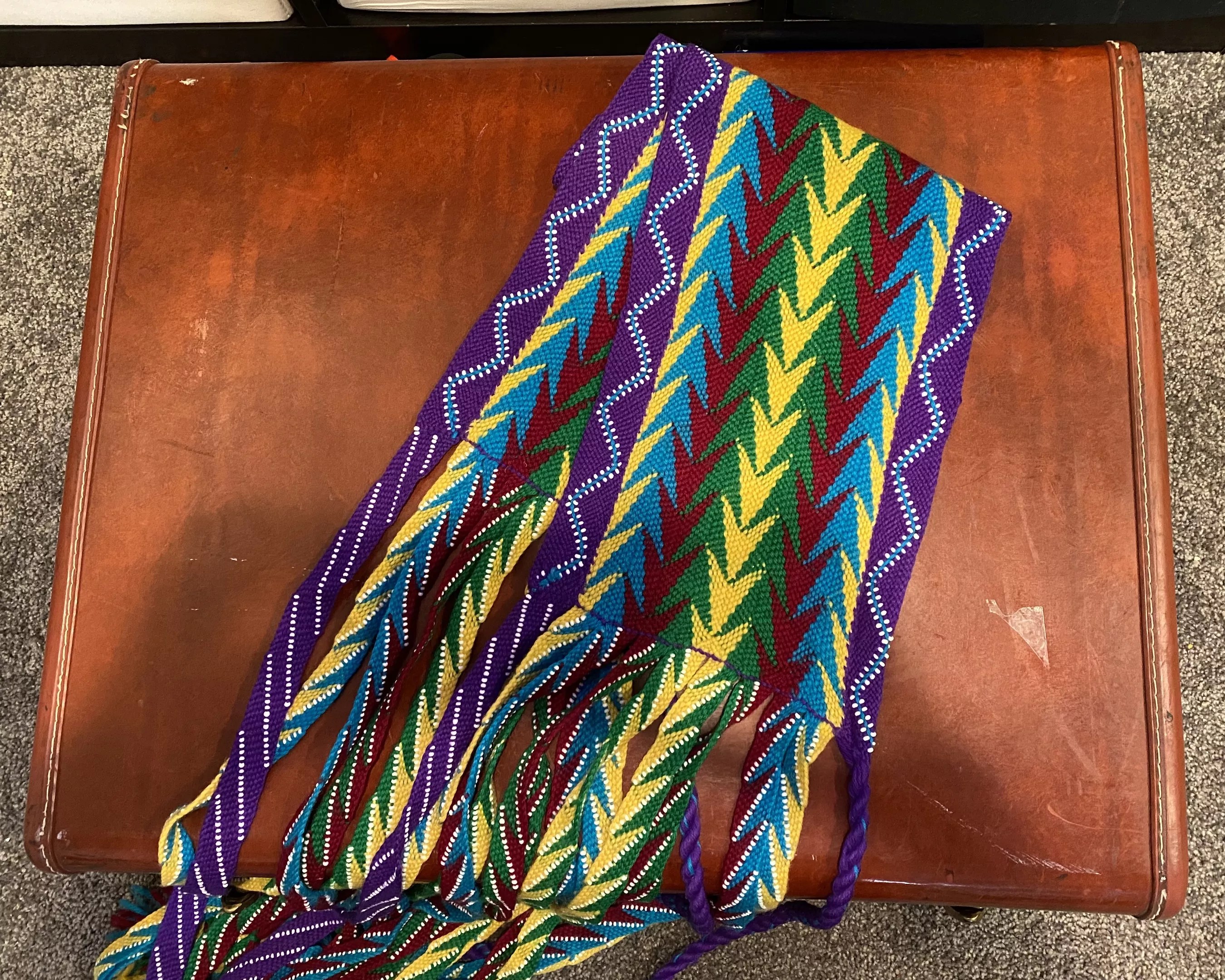 Inside the car were suitcases filled with traditional Osage regalia. The items stolen are described as “two finger-woven women’s belts, girl’s broadcloth ribbon work skirt, man’s suit (leather leggings and broadcloth ribbon work breechcloth), boy’s broadcloth suit (leggings and breechcloth), man’s horsehair roach and spreader, boy’s horsehair roach and spreader, man’s and boy’s moccasins, eagle wing fan, beaded bandoliers, women’s beaded leggings (moccasins), and various adornments and jewelry. These items were in two vintage brown and blue hard-sided suitcases.”