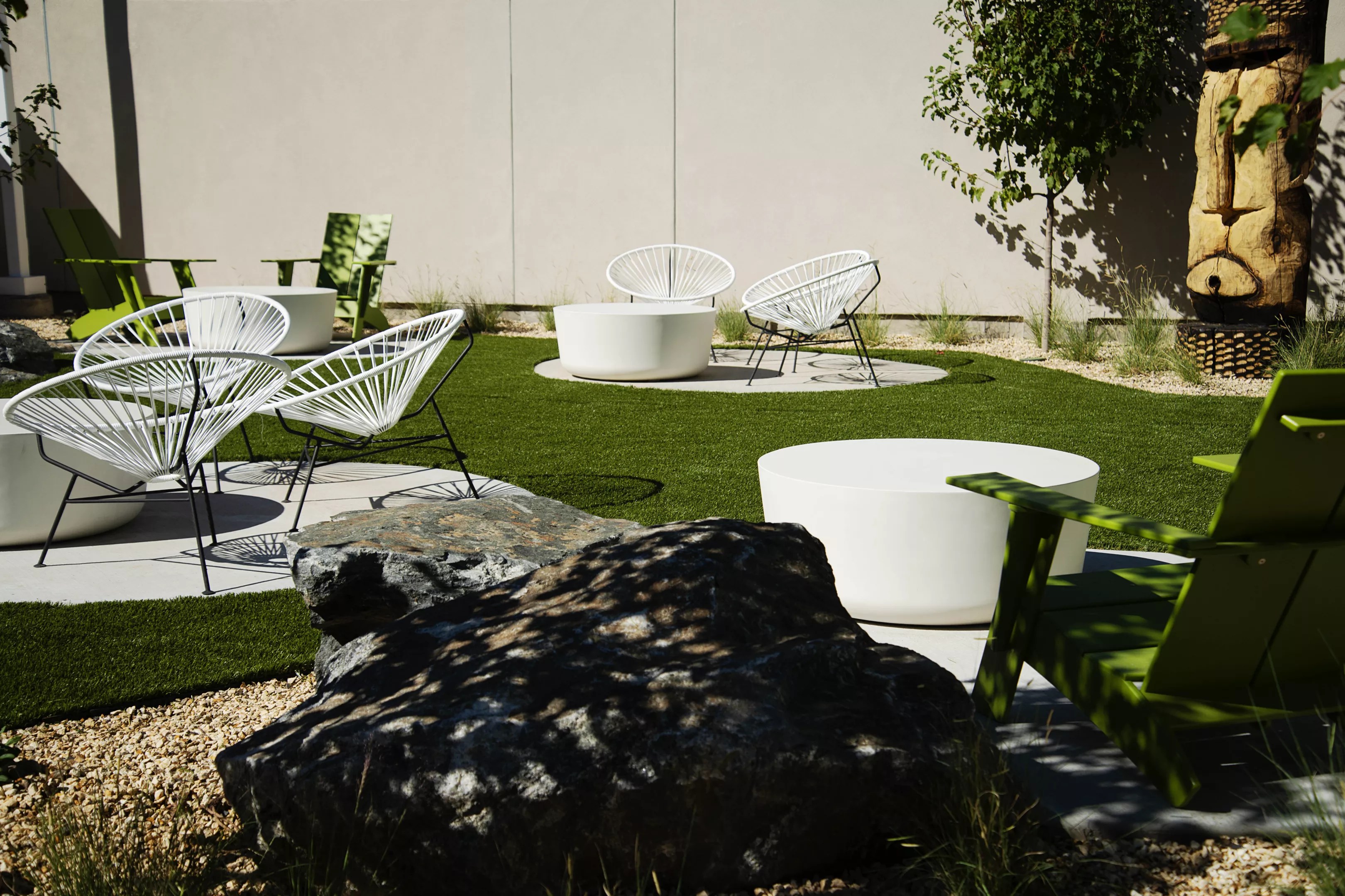 Now it’s making a comeback as Tom’s Starlight, a concept inspired by Palm Springs in the 1970s. “The architecture of the building dictates what we’re doing here,” Messina explains. The interior deli counter is now a cocktail bar, and there are hues of brown and cream with pops of orange and avocado. Outside, 32 of the 40 parking spaces have become a sprawling space with an AstroTurf-covered lawn area, fire pits, twelve-foot-tall tiki totems, private cabanas, fountains, lighting that can change colors, and a music system that will carry jazz tunes throughout the space.