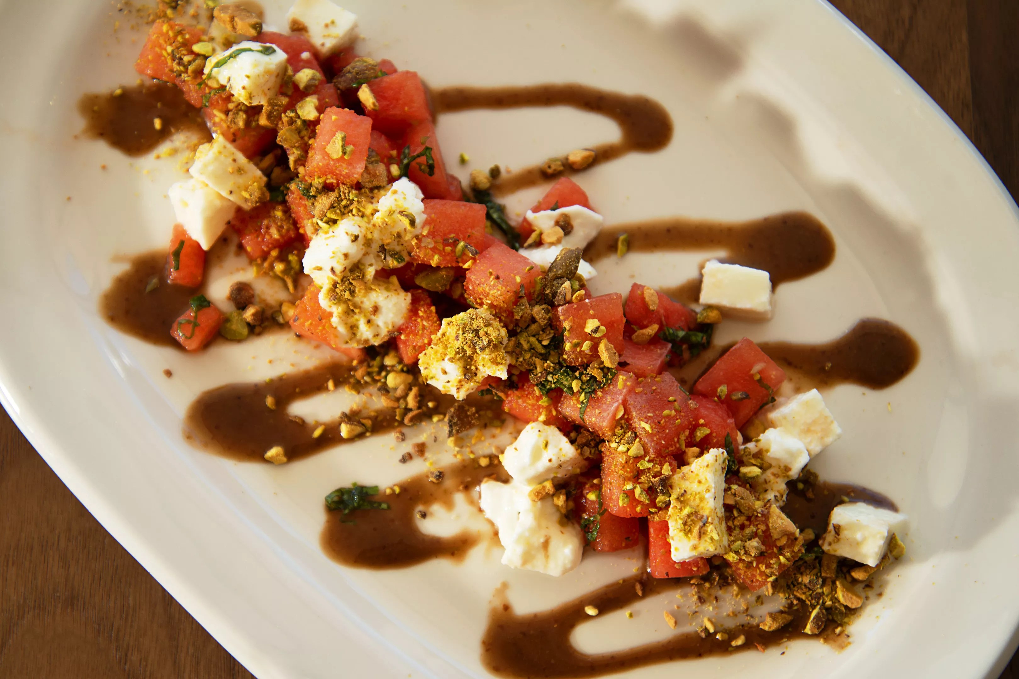 The watermelon salad is one of several dishes with a flair for retro Palm Springs.