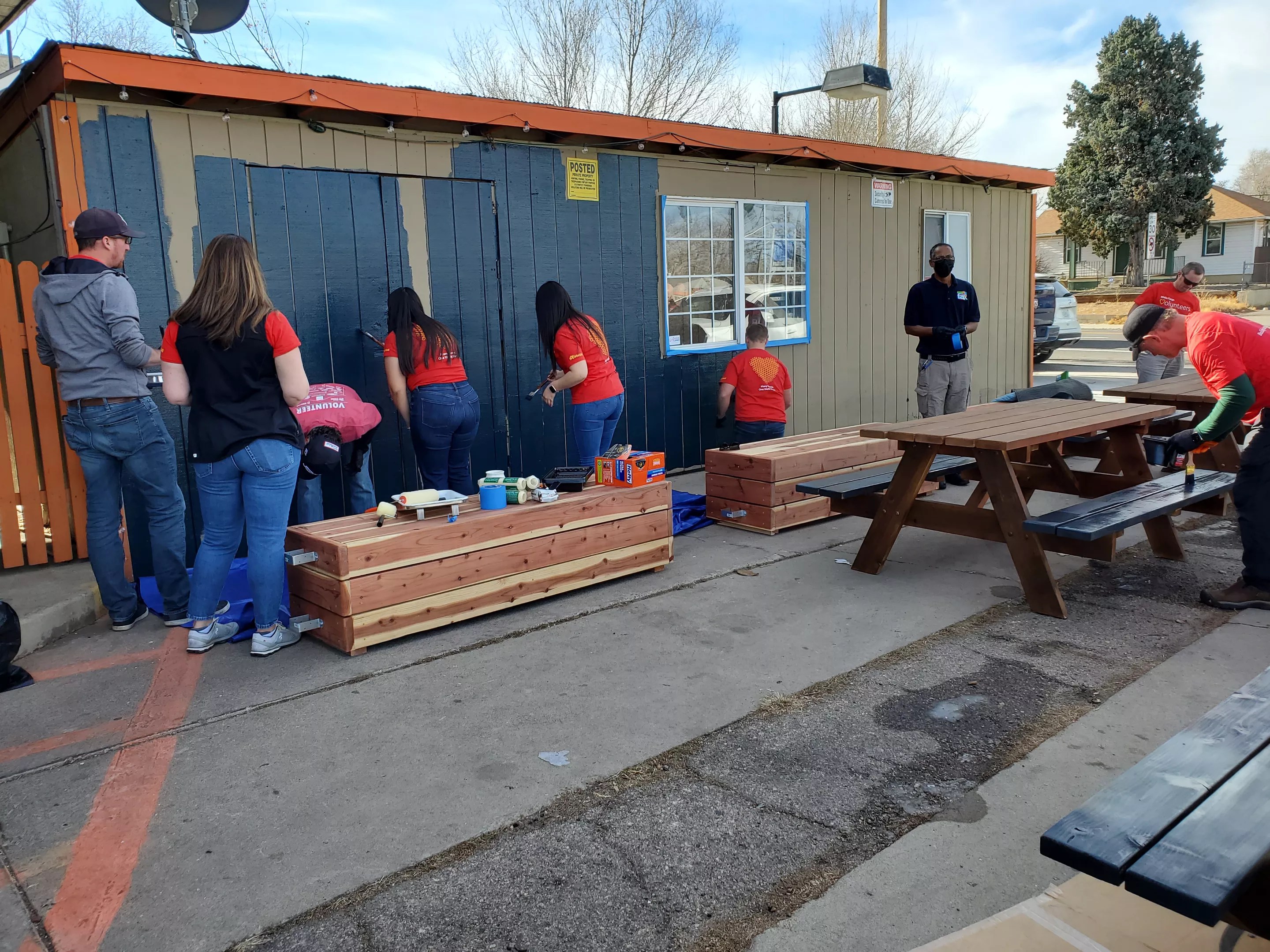 Restaurante El Tamarindo serves Central American food, and the grant covered a new, brightly colored mural by Denver artist Tom Ward that pays homage to Santillanes’s Salvadorian heritage. On December 14, Wells Fargo volunteers were on hand, helping to stain tables that will be used in a new outdoor seating area; the restaurant also received a new sign.