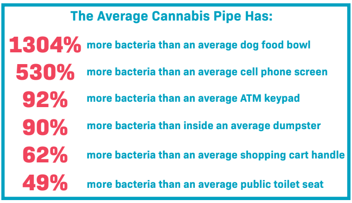 That sharing pipes, bongs and joints would increase exposure to bacteria only makes sense, but research by a pipe accessory company, of all things, shows that our smoking pieces are likely covered with even more germs than we think. According to the study’s results, widely shared pipes can have nearly 50 percent more bacteria on their mouthpieces than an average public toilet seat, and 90 percent more bacteria than the inside of an average dumpster.